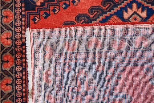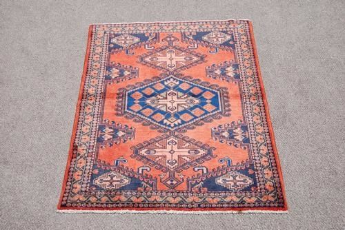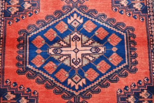 BEAUTIFUL AUTHENTIC HAND MADE PERSIAN VEESE RUG, SIZE 3.7 X 5.3 FEET, MADE OF FINE QUALITY BABY LAMB'S WOOL PILE ON COTTON FOUNDATION, ALL NATURAL VEGETABLE DYE, INCORPORATING A STYLISH GEOMETRIC PATTERN ON A PALE RED BACKGROUND, A ROW OF THREE LARGE MEDALLIONS, CROWNED CORNERS AND NICE INTRICATE FLORAL BORDER. HAND WOVEN IN VEESE, Iran.