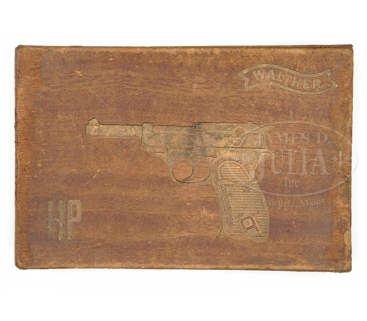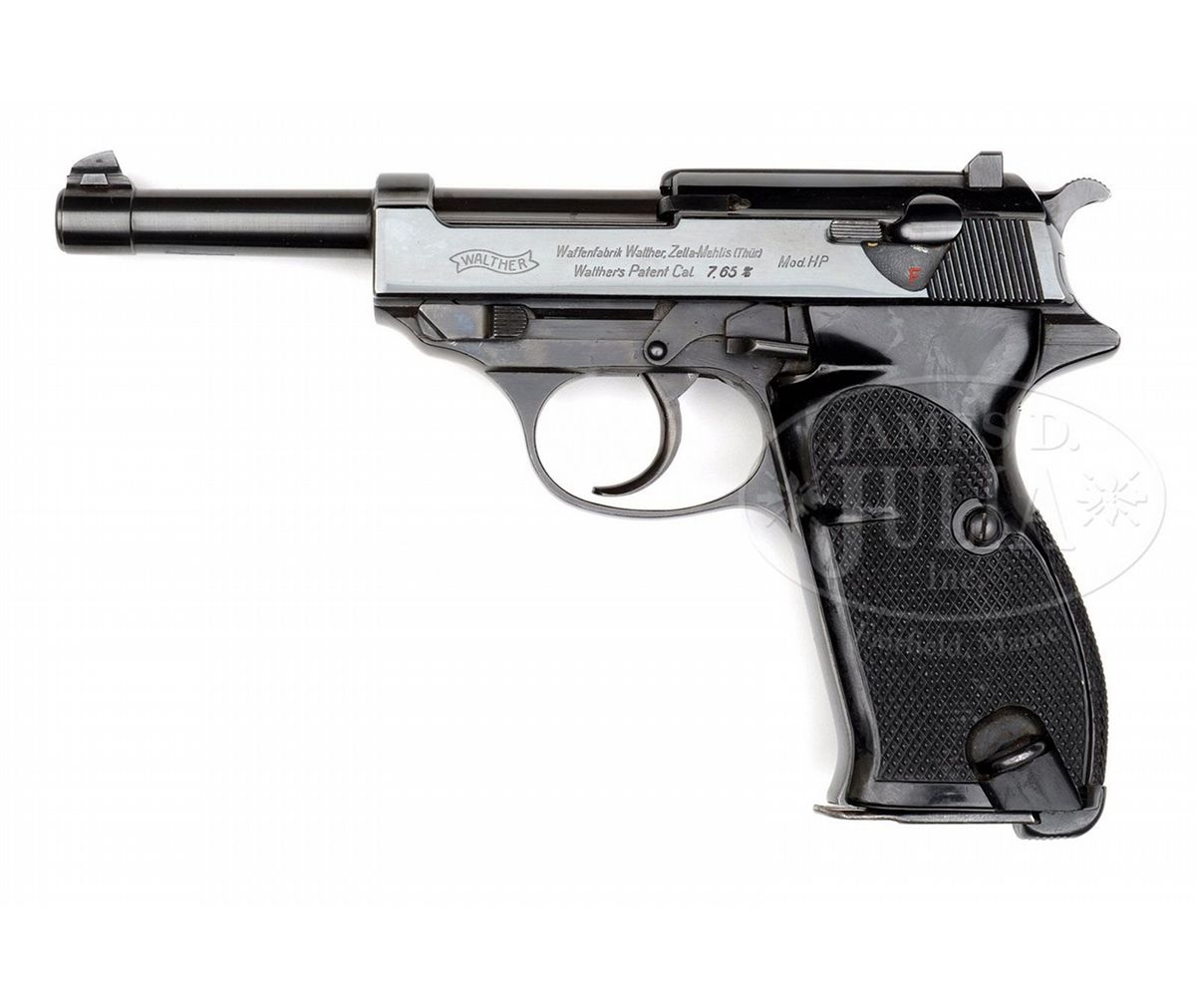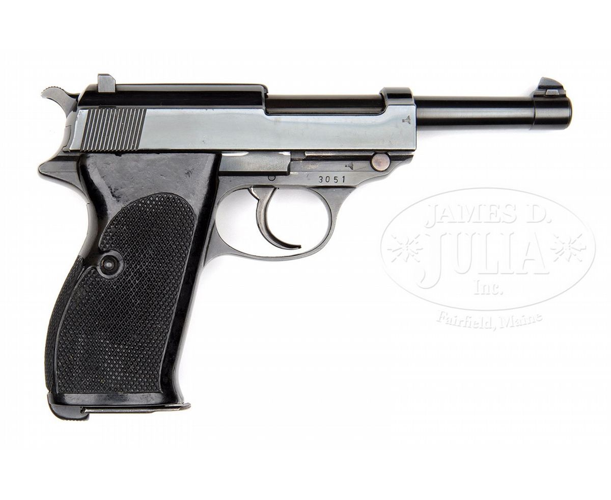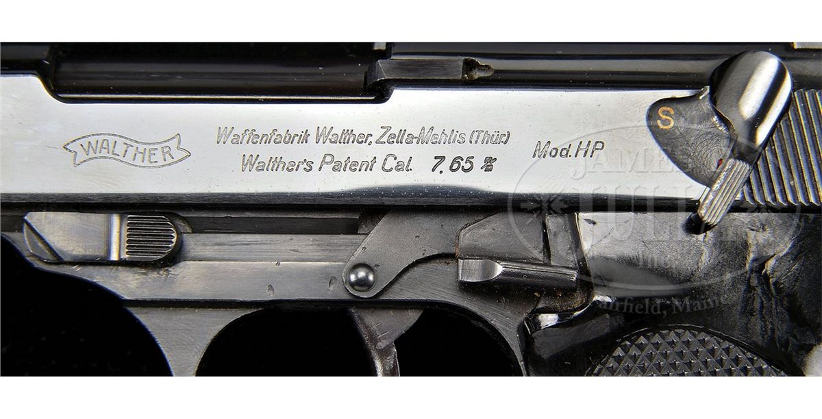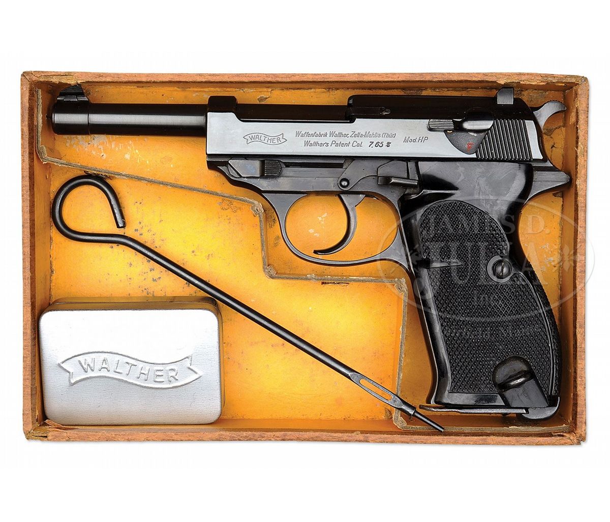 SN 3051. 4.9" 30 Cal. bbl. "WALTHER" banner, "Waffenfabrik Walther, Zella-Mehlis (Thur.) / Walther's Patent Cal. 7.65 m/m" and "Mod. HP" on left side of slide. Eagle/N proofs on right side of slide and frame. Early Walther high polish blue finish. All numbered parts are matching. Wide border checkered black plastic grips. Unnumbered magazine marked Eagle/"359" on spine and stamped "P.38" on left side of body. In original brown wood grain cardboard Walther HP box with Walther banner, image of pistol and "HP" in gold block. Last two digits of serial number are visible on paper label on outside of the box that is partially missing. Full serial number is written in pencil on the inside lid along with other information and the date "August 29. 1944". Box has internal divider to separate gun and cleaning rod from a Walther banner aluminum box for cleaning kit and spare magazine. PROVENANCE: Collection of Dr. Geoffrey Sturgess. CONDITION: Excellent retaining 98% orig bright blue. Bore is bright and sharp. Grips are excellent retaining orig gloss with almost no wear. Magazine retains 95% blue. Mechanics are excellent. Aluminum cleaning kit box and cleaning rod are near new. Cardboard box is very good retaining its shape with scattered flaking on the surface, and corners and edges that have seen some repair to keep it solid. 4-52634 BWS113