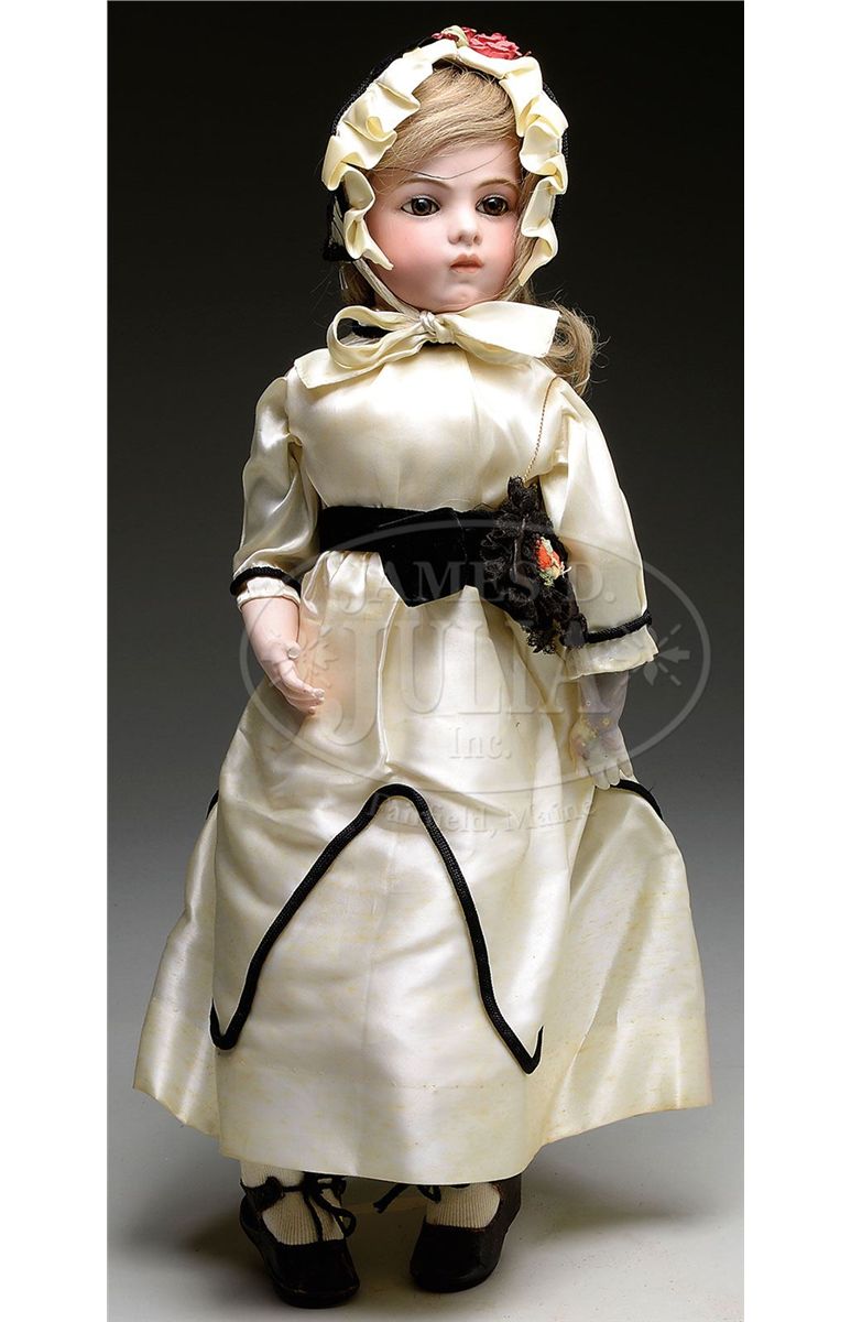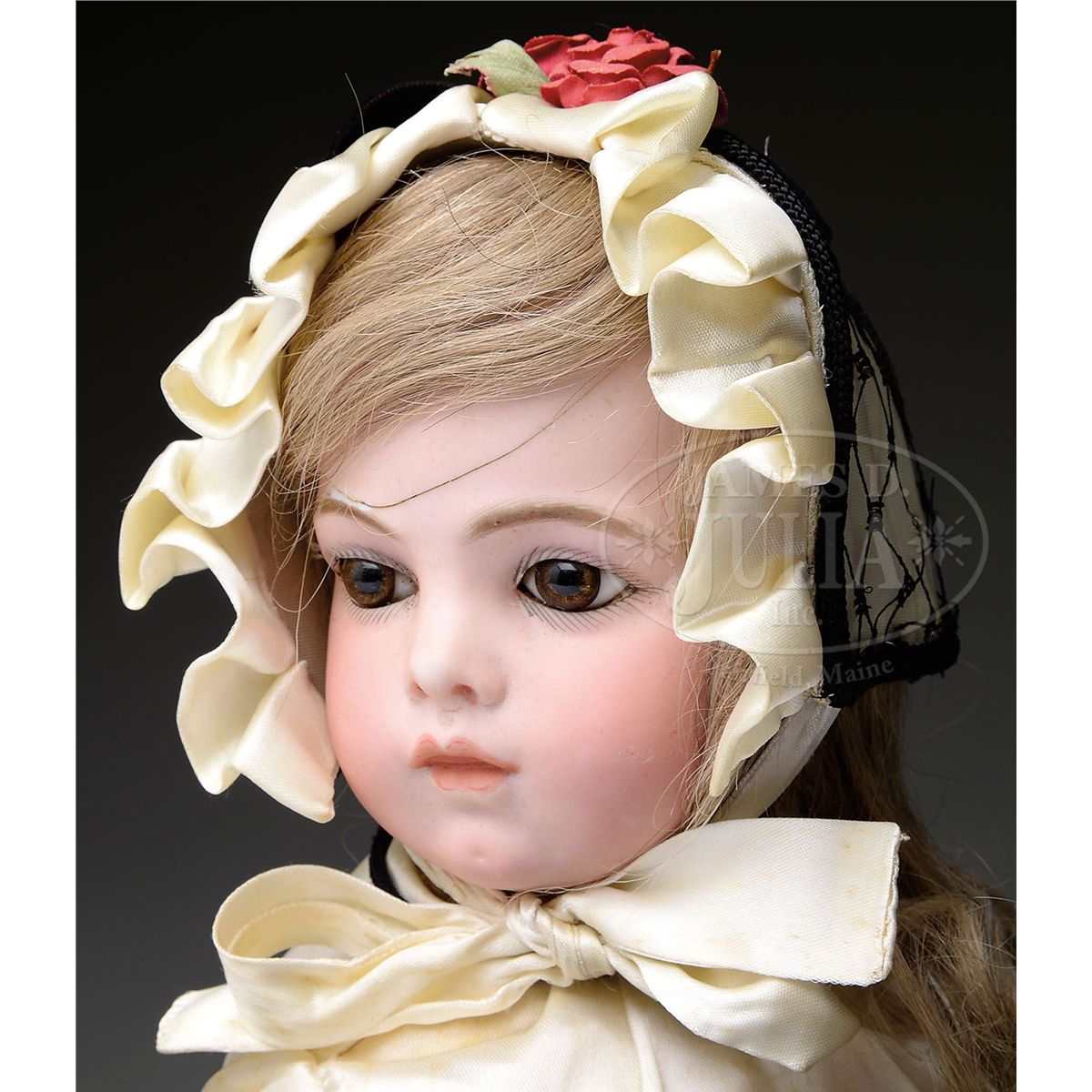 Both head and shoulder plate incised "Bru Jne 8" with lovely amber paperweight eyes, open/closed mouth with predominate tongue tip protruding between the lips. On all leather body with narrow waist and gussets at the hips and knees. She has kid over metal upper arms and bisque lower forearms on a hinge joint. Both wig and clothing are replacements however she does retain antique shoes which are impressed on the soles "Bru Jne Paris 10". SIZE: 23" (58 cm). CONDITION: Serious damage to head with a break across the forehead and another serious break on the left side of the face extending around the ear to the crown and back. Tape holding pieces together at this point. Thumb missing and one finger is chipped on right hand, index finger missing on left and entire hand has previous old restoration. 1-13387