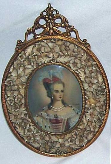 CARVED FLOWERS FRAME HANDPAINTED MINIATURE PORTRAIT. This is a wonderful antique picture frame made of bronze with carved flowers. The handpainted miniature portrait is signed at right. Measures approx 6.25in x 4.25in