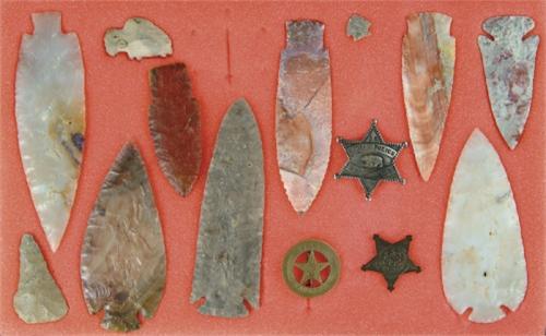 BEAUTIFUL CASED FLINT REPLICA POINTS. Made of flint ridge, flint, alabates, etc. Reproduction police badges. CONDITION: Very good. 9-25984-180 The Tennessee Collection of Prehistoric Indian Artifacts from the Allen Graves Estate. SPECIAL NOTE: We do not regularly sell Prehistoric Indian stone artifacts and therefore have very little experience and no expertise in this area. All of the following lots have come from the Collection of the Late Allen Graves of Tennessee. The collection was inherited some years back by his daughter, who now lives in Maine. This collection was consigned to us directly from her. We employed someone to generally identify styles and types, but as stated above, due to our lack of expertise in this field, we can not guarantee the age or origin of the following pieces. We are relying on you, the buyer, to determine to your satisfaction the origin and age of each item in the collection.
