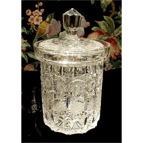 </font></strong>Beautiful Czech vintage circa 1950-60 hand cut crystal lidded Ice bucket or Cookie/Biscuit jar. Until recently, this type of Czech Art glass was "forgotten" in American publications on the subject. Please refer to the book of "Collectible Bohemian Glass 1915-45, Vol. II" by Robert & Deborah Truitt, which is an excellent source of information for Collectors in this field. Pages 6 -31 cover cut glass . In the Encyclopedia of Glass, Phoebe Phillips gives high praise to the cut glass of Christian Dorflinger when she writes "... it was considered at one time to make the best crystal in the United States, good enough to match that of all but the best Bohemian (Czech) craftsmen". Condition is wonderful with no damage. Dimension : 11"H x 6.75 in diameter, "signed" on paper label : Worlds finest Imperlux - Genuine hand cut crystal - Made in Czechoslovakia.</font>