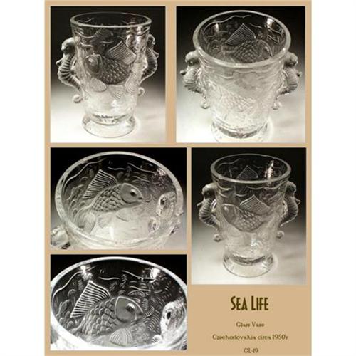 Beautiful Czechoslovakian SEA LIVE glass vase with sea horse handles, fish and sea weeds. Excellent condition, no chips, cracks or repairs. Dimension : 7-1/4" high, Czechoslovakia, Libochovice Glassworks circa 1950's.