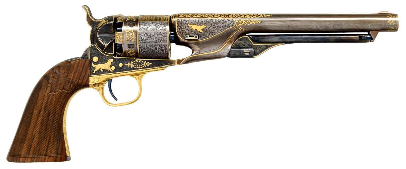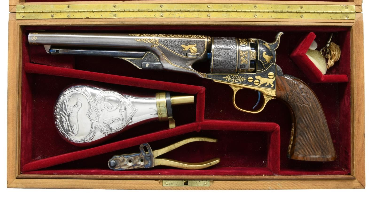 REVOLVER. Cal. 44. S# 113487. Original 1860 Colt revolver engraved by Dewil of Liege, Belgium. Frame, backstrap, cyl., bbl. & loading lever have panels of fine scroll engraving. Panels are surrounded by gold borders leading to areas of raised gold wire inlaid scroll. Gold inlaid figures on the bbl. flats & frame include hunting dogs, pheasants & foxes. Gold finished trigger guard w/ matching scroll. Top of bbl. has gold inlaid marking "ADDRESS-COL-SAMl COLT-NEW-YORK-US-AMERICA". Bottom of bbl. lug has gold inlaid mfg. marking "DEWIL-LIEGE". Sides of frame have gold inlaid "COLT'S PATENT" markings. Action screws are gold finished. Trigger guard & frame have matching original numbers. Bbl. has remarked matching number. Numbers are not visible on backstrap or cyl. due to engraving. Bbl. 8" round w/ German silver blade sight. Bbl. & cyl. have a fine brown finish. Frame, hammer, loading lever & backstrap have a case colored finish. Trigger is fire blued. 1 piece walnut grip w/ fine hand checkering & leaf carving. UNATTACHED ACCESSORIES: wood casing w/ red velour fitted interior. Case contains a nickel finished powder flask, 2 cavity brass bullet mold & case key. CONDITION: very fine. Frame & other case colored parts retain over 95% dark colors. Bbl. & cyl. have attractive light brown finish showing some fading. Grips show a few small handling marks. Smooth mechanics. Pitted bore retains largely intact gain twist rifling. (01-24180/DS). ANTIQUE. $10,000-15,000.