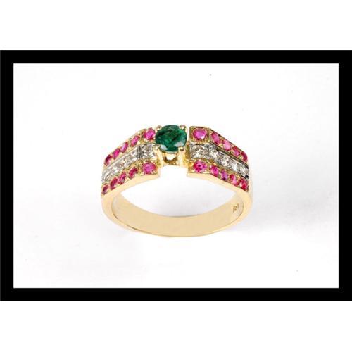 Diamond 0.34 ct , ruby and emerald 1.20 ct , yellow gold 18 ct . Ring size is 7 and can be altered up to two sizes plus or minus upon request free of charge .
