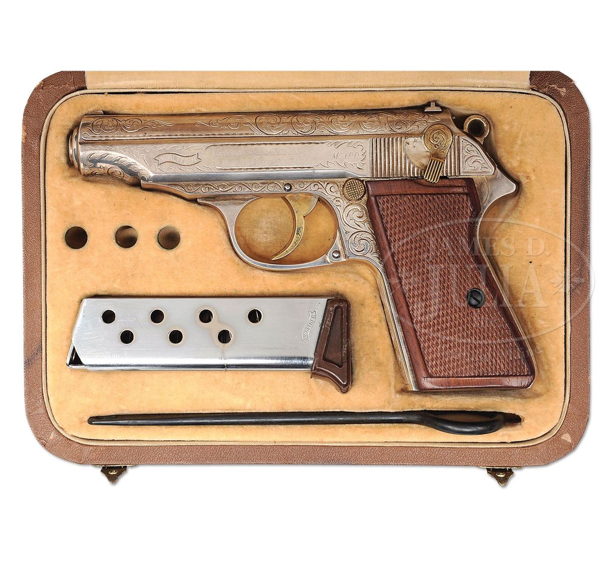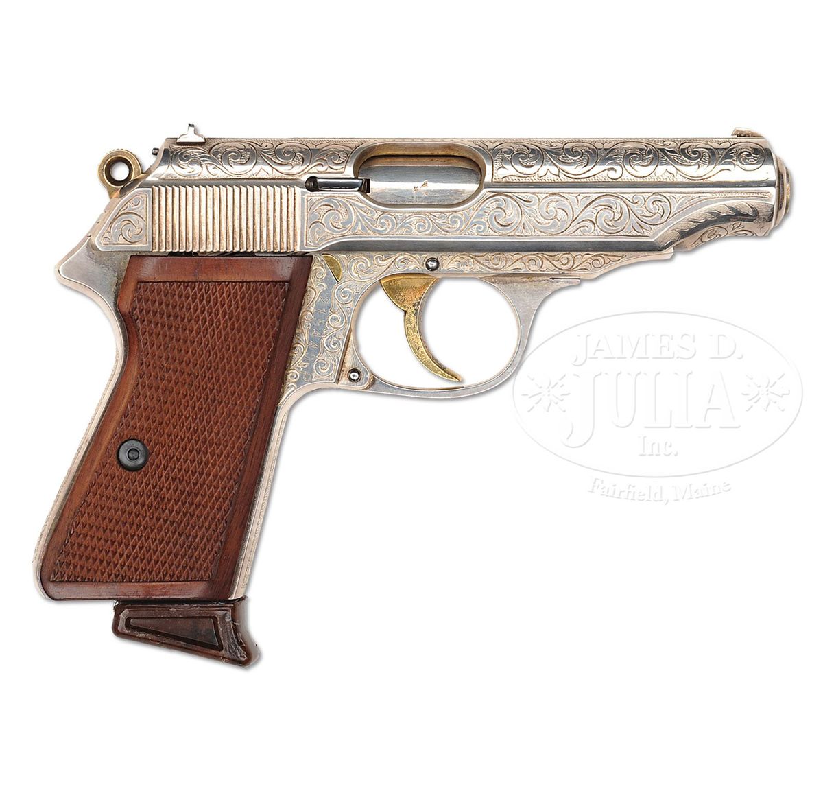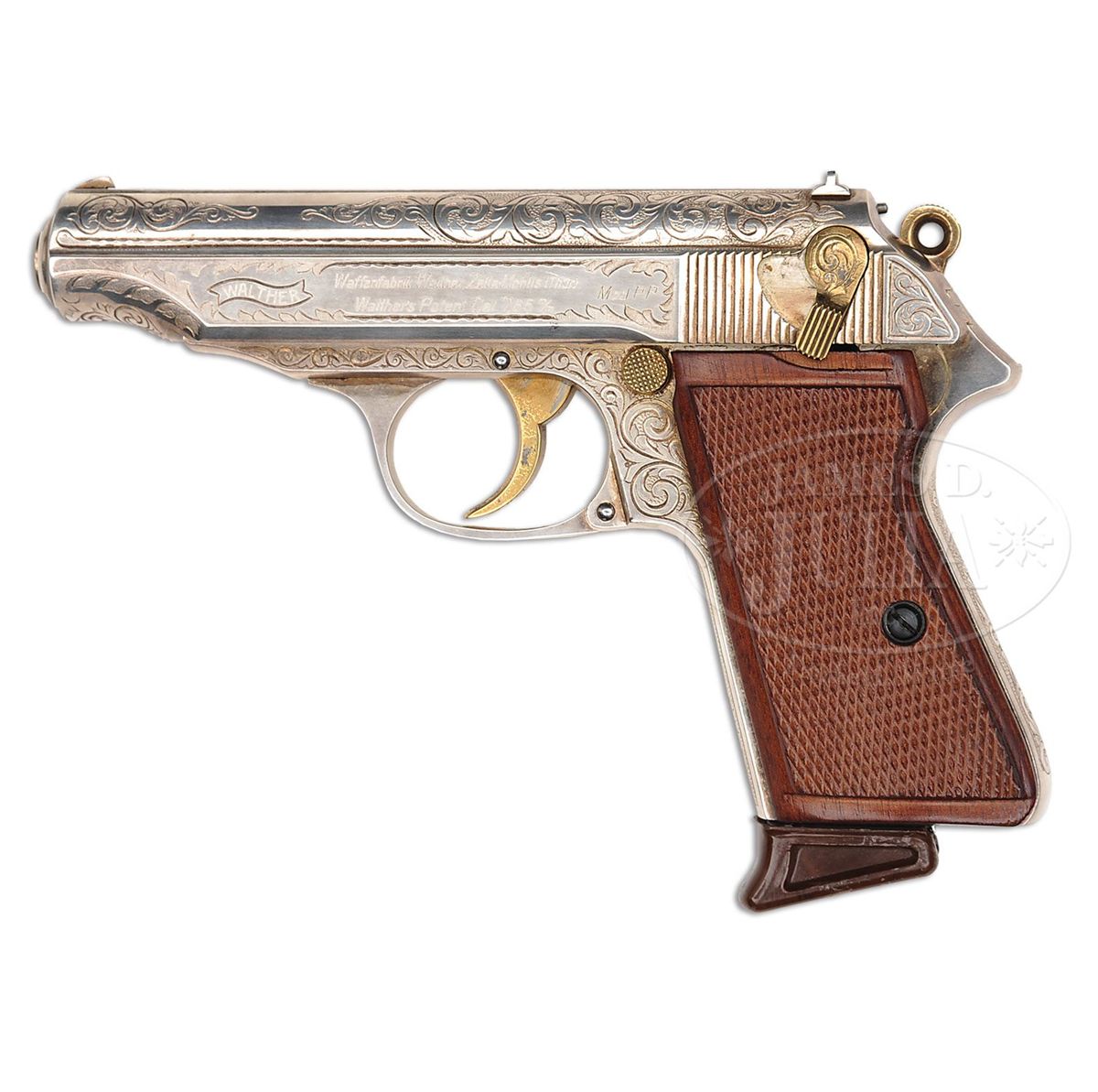 SN 215440P. 4" 7.65mm (32 ACP) bbl. "WALTHER" banner, "Waffenfabrik Walther, Zella-Mehlis (Thur.) / Walther's Patent Cal. 7.65m/m" and "Mod. PP" on left side of slide. Eagle/N is visible on the bbl through the ejector port. Scroll engraving covering about 85% of exterior surface including right and left sides of frame and slide and front and rear gripstraps. Trigger, hammer, and magazine release button are gold plated as is the safety lever which is also engraved. The rest of the gun is silver plated. Wide bordered checkered walnut grips. In a factory brown leatherette case with "WALTHER" banner/ "PP" gold blocked inside the dark cream velvet lined interior. Case is fitted for the gun, cleaning rod, and the brown plastic bottom chrome plated magazine which has a "WALTHER" banner and a number that does not match the gun. PROVENANCE: Collection of Dr. Geoffrey Sturgess. CONDITION: Retains 98% silver plating and about 90% gold plating which is starting to flake off the front and side surfaces of the trigger. Bore is bright with light wear. Grips are near mint with sharp checkering. Mechanics are sound. Magazine and cleaning rod are in near new condition. Exterior of the case is excellent with some minor scuffs and flaking especially on the edges. Interior has oil stains that have darkened the light velvet in the shapes of the gun and accessories. 4-52638 BWS123