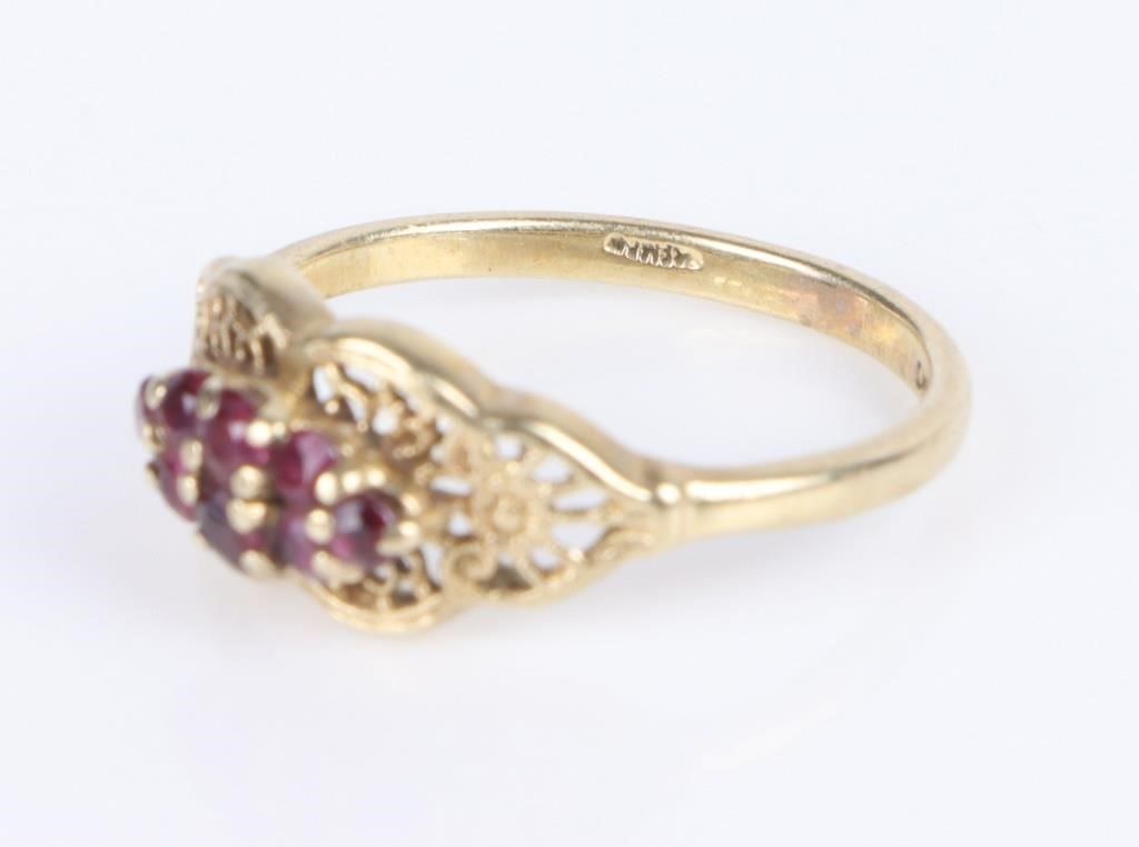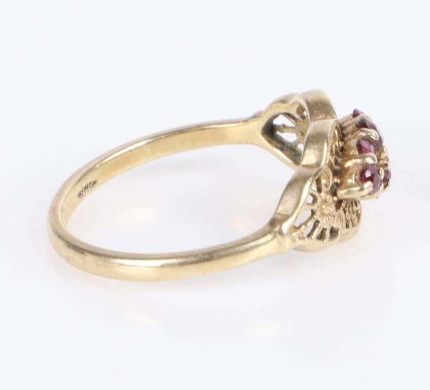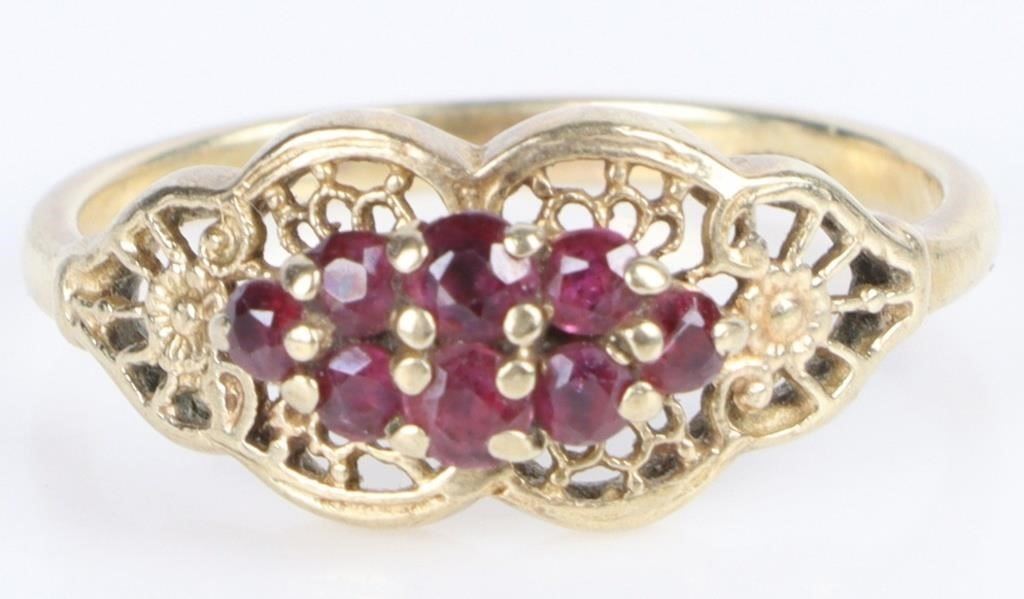 Beautiful filigree 10K yellow gold ruby cluster ladies ring.