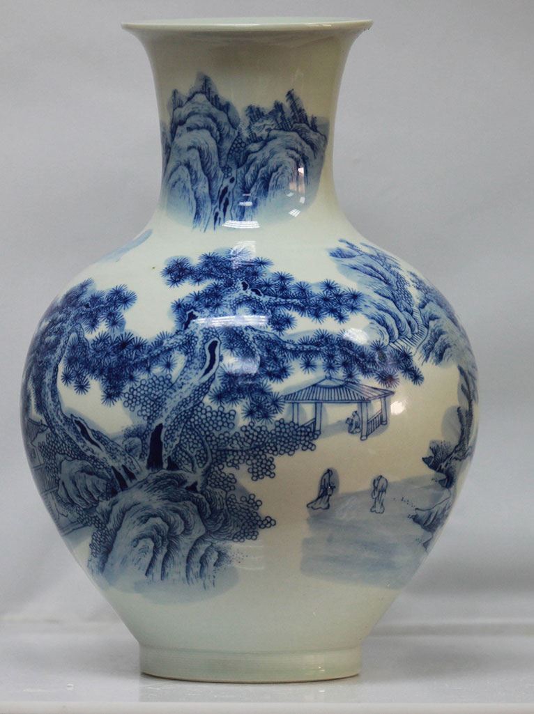 BEAUTIFUL FLORAL CHINESE PORCELAIN VASE **|**|** VINTAGE STYLE CHINESE PORCELAIN VASE W A DARK BLUE DESIGNED LOTUS FLOWERS ON A GRAY BACKGROUND