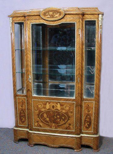Two glass shelves with mirrored back and bottom. Inlaid front with cupid motif bronze ormolu appointments. Beige marble top. 69" high, 44" wide, 17 1/2" deep.