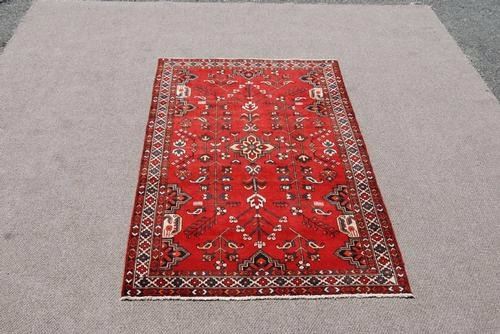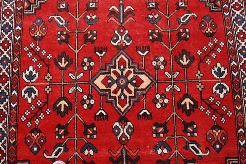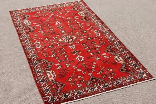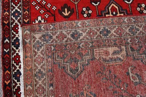 BEAUTIFUL HAND WOVEN PERSIAN NAHAVAND RUG. SIZE 4.7 X 8.0 FEET, MADE OF FINE QUALITY BABY LAMB'S WOOL PILE ON COTTON FOUNDATION, ALL NATURAL VEGETABLE DYE, THE WEAVER UTILIZED A VERY RARE AND UNIQUE LOOKING DESIGN, INCORPORATES ALLOVER FLORAL PATTERN ON A RICH RED BACKGROUND. HAND WOVEN IN NAHAVAND, Iran.