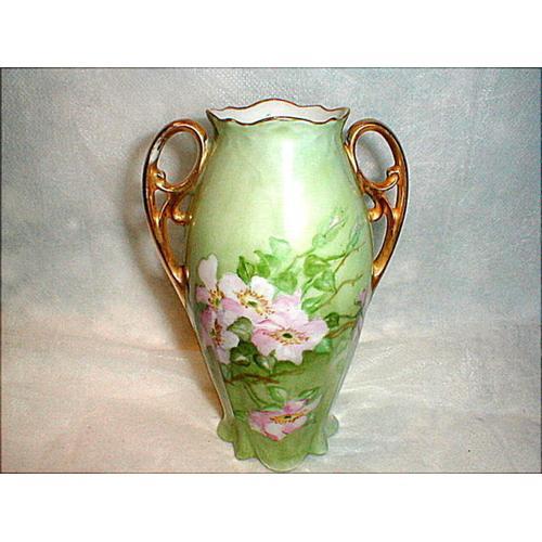 HERE IS A BEAUTIFUL HANDPAINTED VASE THAT IS MARKED M & Z AUSTRIA. THIS VASE MEASURES 6 1/4 IN. TALL AND 4 1/2 IN. WIDE FROM HANDLE TO HANDLE. THE COLORS OF THIS VASE ARE GREEN WITH LOVELY PINK FLOWERS WITH GREEN CENTERS. THE HANDLES ARE GOLD AND THE VASE OPENING IS TRIMMED WITH GOLD. THIS PIECE IS IN WONDERFUL CONDITION WITH NO CHIPS, CRACKS, OR REPAIRS.