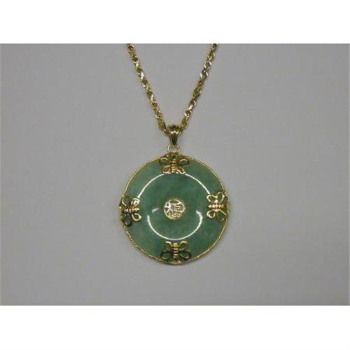 Beautiful round jade pendant with 14K "good luck" character in the middle. Also has butterflies in 14K. Brand new celedon green pendant from China. Please look at my other jade jewelry. Thank you.