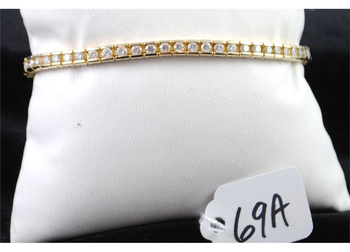 BEAUTIFUL LADIES 14K YELLOW GOLD DIAMOND TENNIS BRACELET WITH FIFTY FIVE ROUND FULL CUT DIAMONDS - APPROX. 3CTTW - WITH SAFETY CHAIN - WEIGHS 15 GRAMS - APPRAISED RETAIL REPLACEMENT IS $4,500.00 - COMES WITH THE JEWELERS APPRAISAL CARD FOR INSURANCE