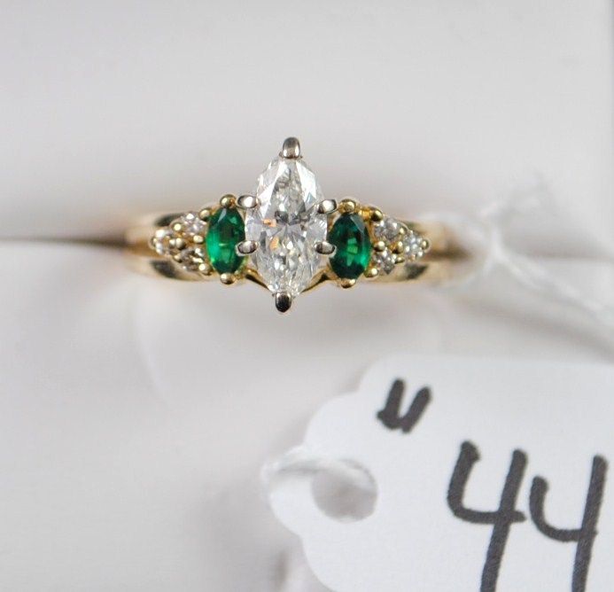 BEAUTIFUL LADIES EMERALD AND DIAMOND RING WITH ONE MARQUISE CUT APPROX. .75CT DIAMOND SOLITAIRE AN