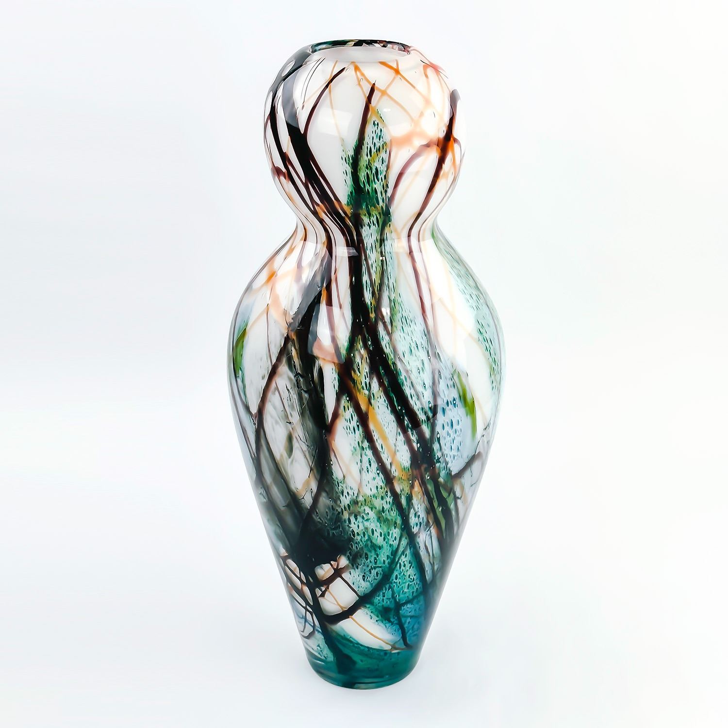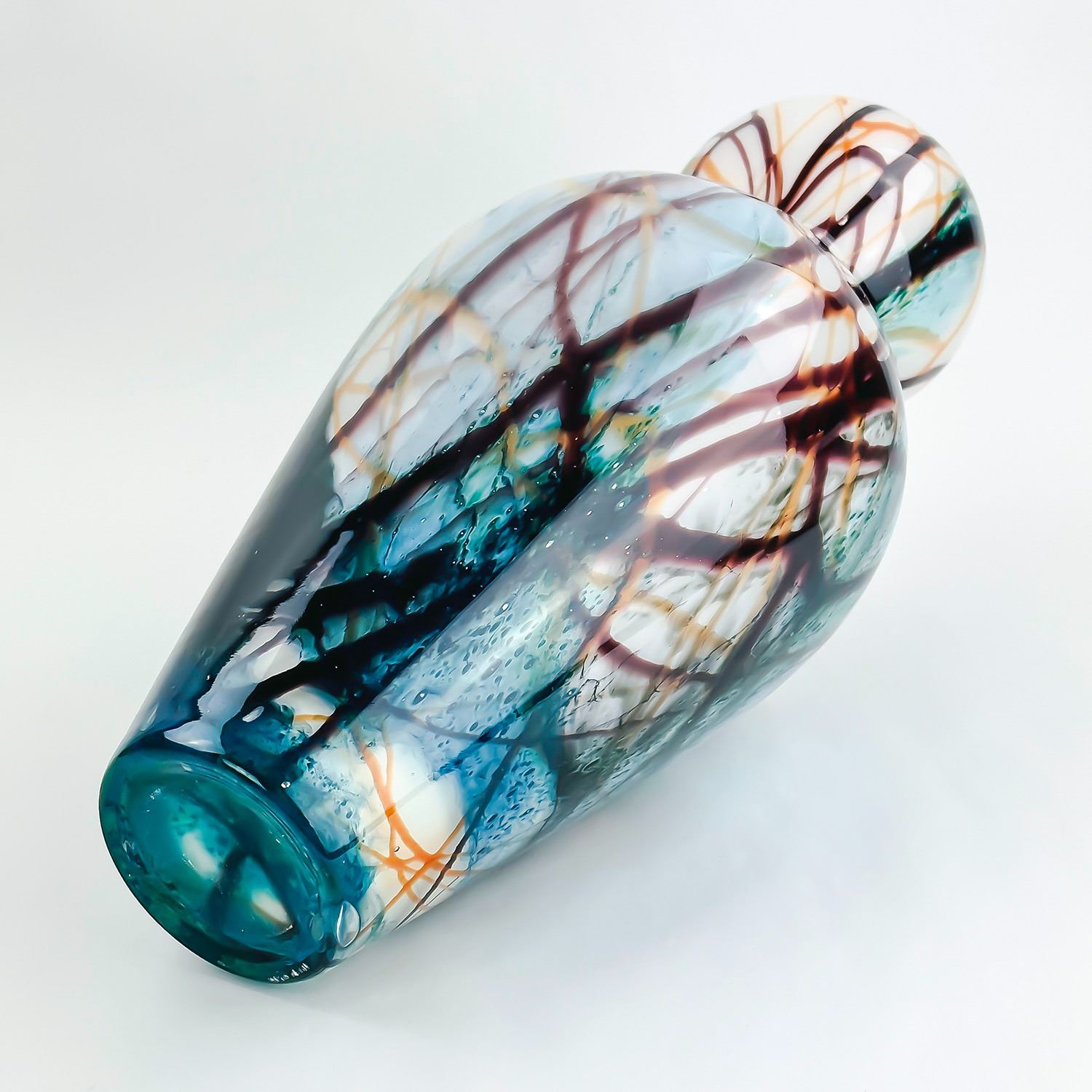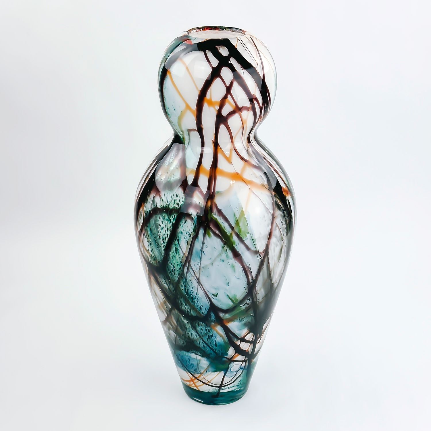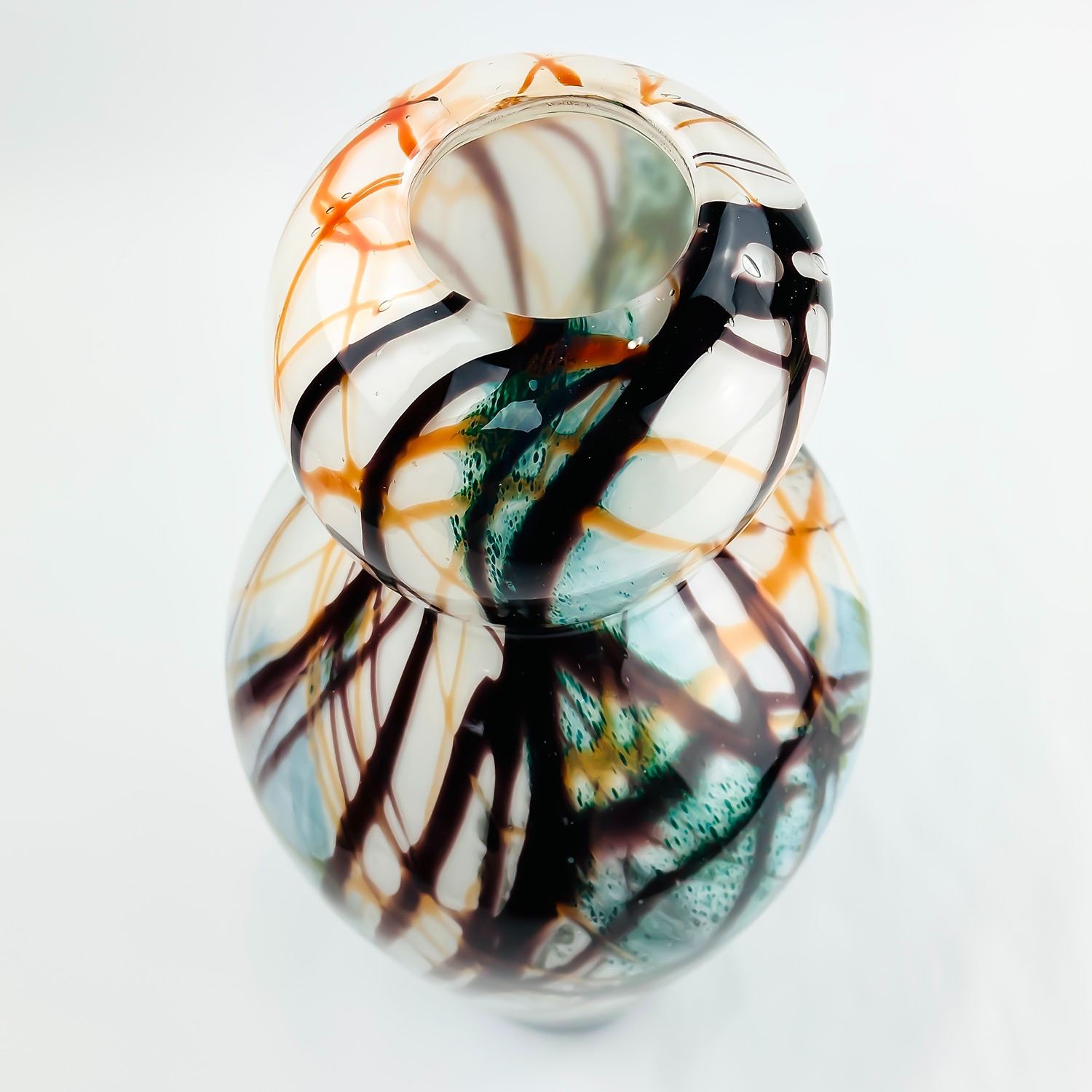 #8033 - UNSIGNED BLOWN ART GLASS VASE, MULTI-COLORED SWIRL DESIGN. MEASURES: 16.5” (42 CM) TALL BY 6.75” (17 CM) WIDEST MIDLE DIAMETER***ITEM(S) LOCATED IN LETHBRIDGE ALBERTA. FREE TRANSPORT TO EDMONTON OFFICE AVAILABLE FOR THIS AUCTION. WORLDWIDE SHIPPING IS AVAILABLE FOR ALL ITEMS