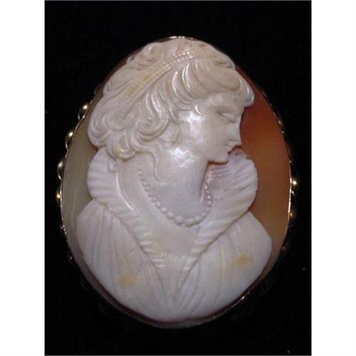 THIS BEAUTIFUL LARGE SHELL CAMEO IS SET YELLOW GOLD FILLED. IT IS SIGNED ON THE BACK. IT MEASURES 2" x 1.75". ANOTHER WONDERFUL PIECE BROUGHT TO YOU BY TASMARIE.