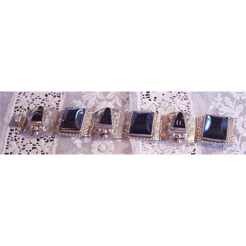 BEAUTIFUL LADIES BRACELET, MADE FROM MEXICAN SILVER FEATURING LARGE WHAT IT LOOKS LIKE BLACK ONYX STONES,LOVE THE WORKMANSHIP, COLORS AND QUALITY,EXCELLENT CONDITION, MEASURES ABOUT 7 1/4" LONG AND OVER 1" WIDE,US BUYER TO PAY 7.00 FOR SHIPPING PLUS INSURANCE,THANK YOU.