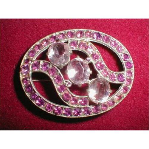 Large broaches are "IN"! This is a beautiful large Victorian broach of amethyst colored stones set in silver-tone metal. 3 large center stones with swirled bars either side. Both bars and outside rim of oval are completely set with deep amethyst colored stones. It has a safety clasp and is in very good condition. It is 2 1/4" x 1 3/4" and dates from the early 1900's.