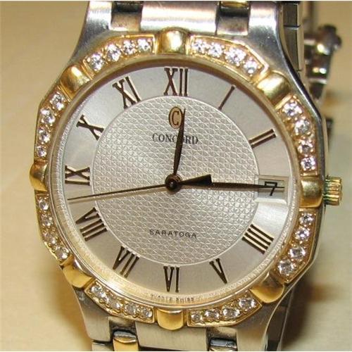 A STRIKING MAN'S WATCH... The Saratoga model by Concord; surrounded by 32 small diamonds! missing two small goldtone caps from watch band, otherwise, in excellent condition!
