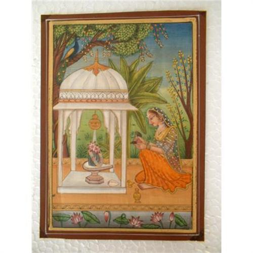 The artist of this painting has excellently shown how a woman worships god for her husbands long life in India. The woman sitting in this painting is worshipping God Shiva in front of her is Shivling. A container is hanging up with a hole at the bottom so that water slowly keeps dripping on the shivling. <p>