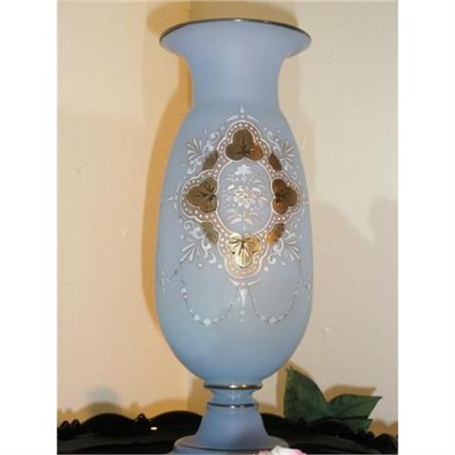 We prsent to you a beautiful MOSER VASE,described as starting with a pedestal base moving up to an urn form body with a flarred out top.Ornately designed over a satin blue opaline surface wiyh delicate white florals enameled and beaded drape style highlights with applied gold gilt. A fabulously artistic pattern.Pedistal base and top is also trimmed in gold gilt. Shows a snapped pontil on the bottom from when this hand blown-hand decorated Moser vase was created. P.S. there is a applied enameled star on reverse.