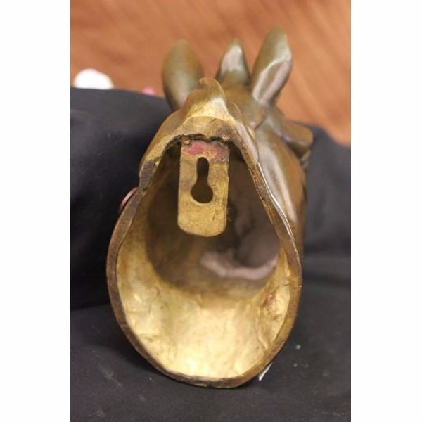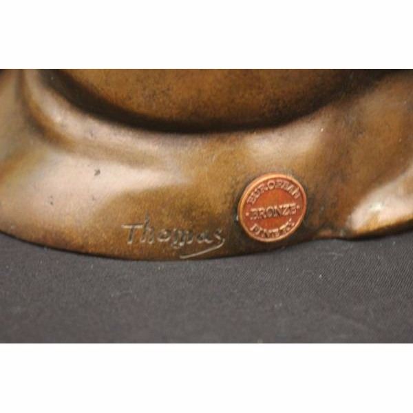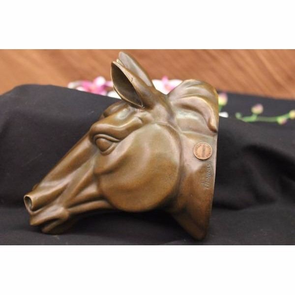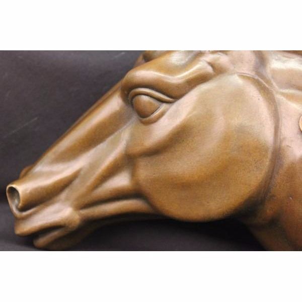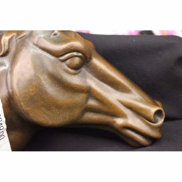 If you love horses this wall piece is perfect for you. The head of the horse will post wonderfully on any wall. The unique features of the horse have been crafted with attention to detail. The smooth curves of the horse's long nose and strong face stand out under the craftsmanship. This sculpture was crafted using the lost wax method. It comes ready to be mounted on a hook or nail. The sculpture is signed Thomas. Condition : This sculpture is in a perfect condition. Bronze Dimensions :Height 7" x Width 7" Weight : 5 LBS Inventory : 27K3623572