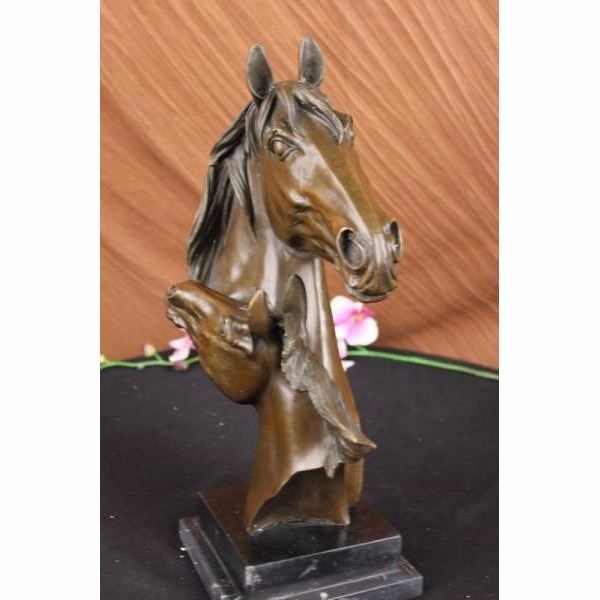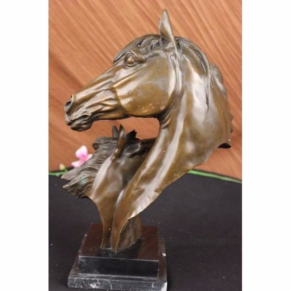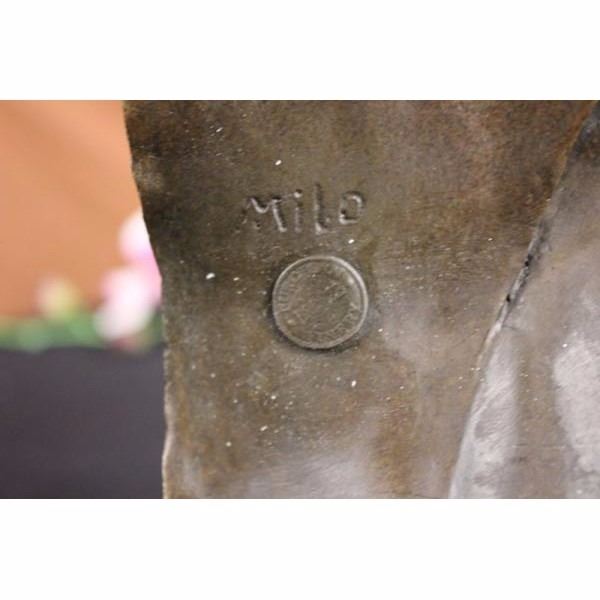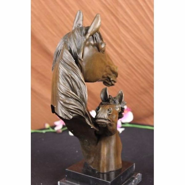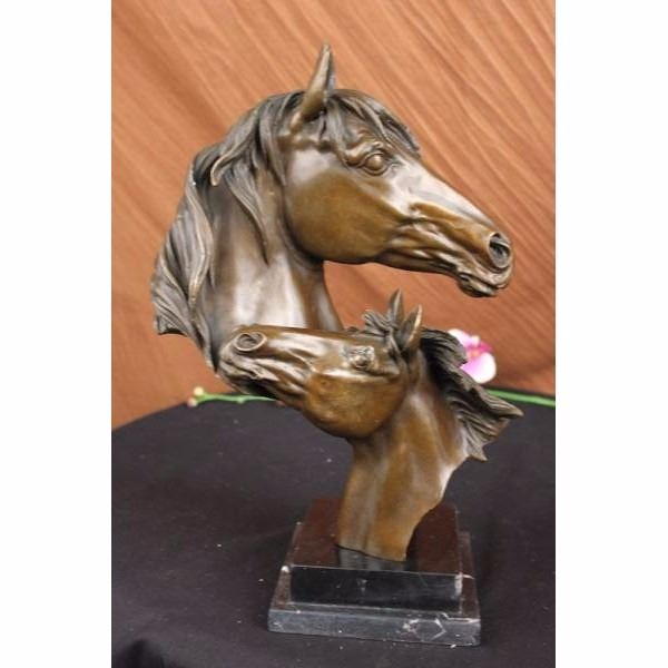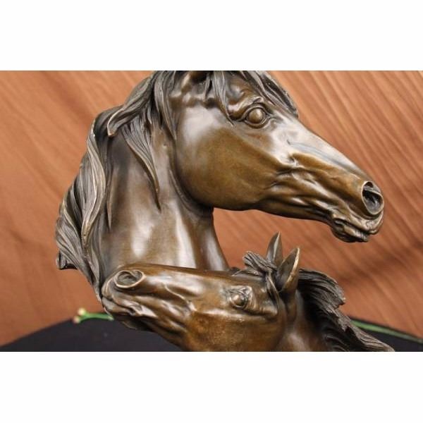 Horses are known and loved for their agility, graceful movement,strong bodies and sleek coat. They ignite a feeling of freedom anduncharted paths. This sculpture is perfect for any horse lover andcollector. A mother and her colt,stand side by side, gazing off intoopposite directions. The mother shadows over the young colt. Theirmane whips in the wild air. 100% bronze and handmade, this brownpatina sculpture was cast using the "Lost Wax Method" and mounted on ablack marble base. It is signed by the artist Milo.World famous sculptor Milo was born in Paris in 1939. He lived most ofhis childhood in Andalusia, Spain. Influenced by an artistic familybackground, he began sculpting at the age of seventeen. Afterapprenticing with several accomplished sculptors both in America andSpain, he began his own work focusing equally on steel and bronze.Horses and other animals were a natural direction of his work tofollow. Surrounded by horses as a child and witnessing the fightingbulls of Spain gave him an instinct for the inherent drama of theseanimals. Combining a special cement mixture with steel has allowed himthe fluidity of metal with the timelessness of stone. This processenables him to capture the essence of the animal's nature. Thecharacteristic rough texture and movement of line make Milo workeasily identifiable in both cement and bronze Condition: This sculpture is in a perfect condition. Bronze Dimensions with Marble Base:Height 16" x Width 11" Marble Dimensions: 5 1/2' X 5 1/2" Height without base: 15" Weight : 16 LBS Inventory : 50DW0097404