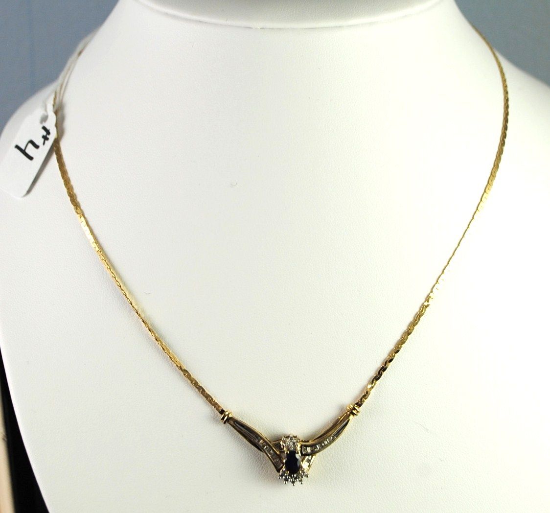 BEAUTIFUL SAPPHIRE AND DIAMOND "V" STYLE NECKLACE WITH ONE OVAL CUT SAPPHIRE CENTER AND TWENTY TWO CHANNEL SET BAGUETTE DIAMONDS - WEIGHS 6.4 GRAMS -APPRAISED RETAIL REPLACEMENT IS $2,500.00 - COMES WITH THE