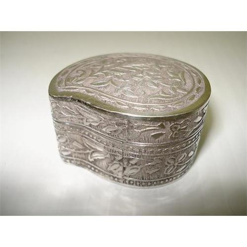 LOVELY SILVER TONE HIGHLY DECORATED, VINTAGE PILL BOX,NOT MARKED AT ALL,UNIQUE SHAPE, NOT SURE IF IT IS SILVER, STERLING OR JUST SILVER TONE, Measuring close to 1 1/2 inch X 1 1/4 inch X not quite 1 inch high, US Buyer to pay 7.00 for shipping plus insurance.THANKS.