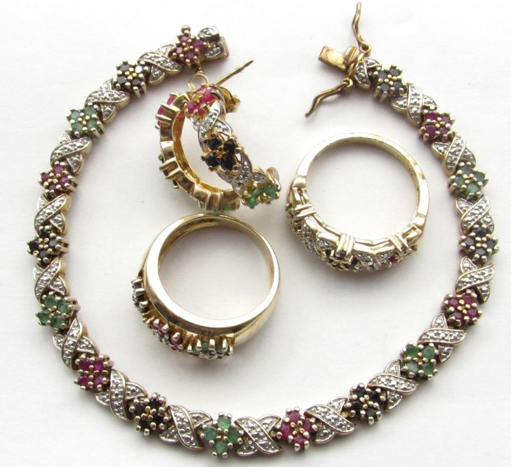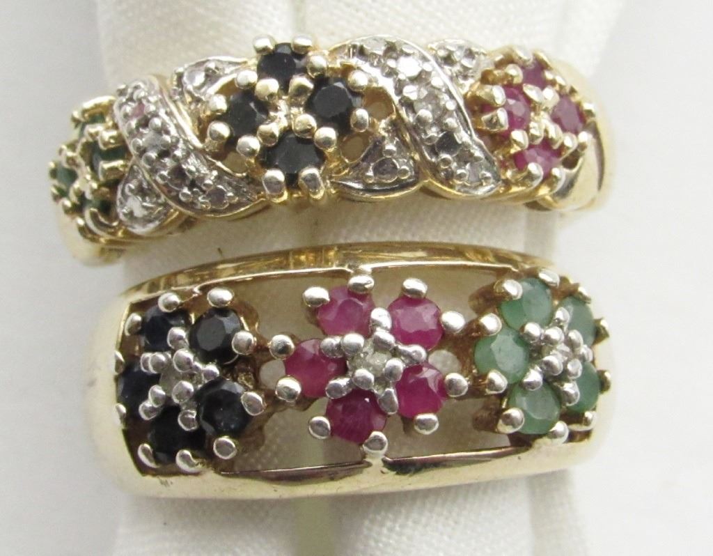 WITH MULTI COLOR FLOWER STONE ACCENTS. (1) BRACELET, (1)PAIR OF EARRINGS, (2)RINGS SIZE 7 & 8. TOTAL 16 DWT.