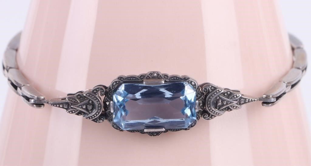 Beautiful vintage emerald cut natural topaz art deco bracelet. The design around the topaz is very intricate and the open back design allows for the topaz to truly shine.