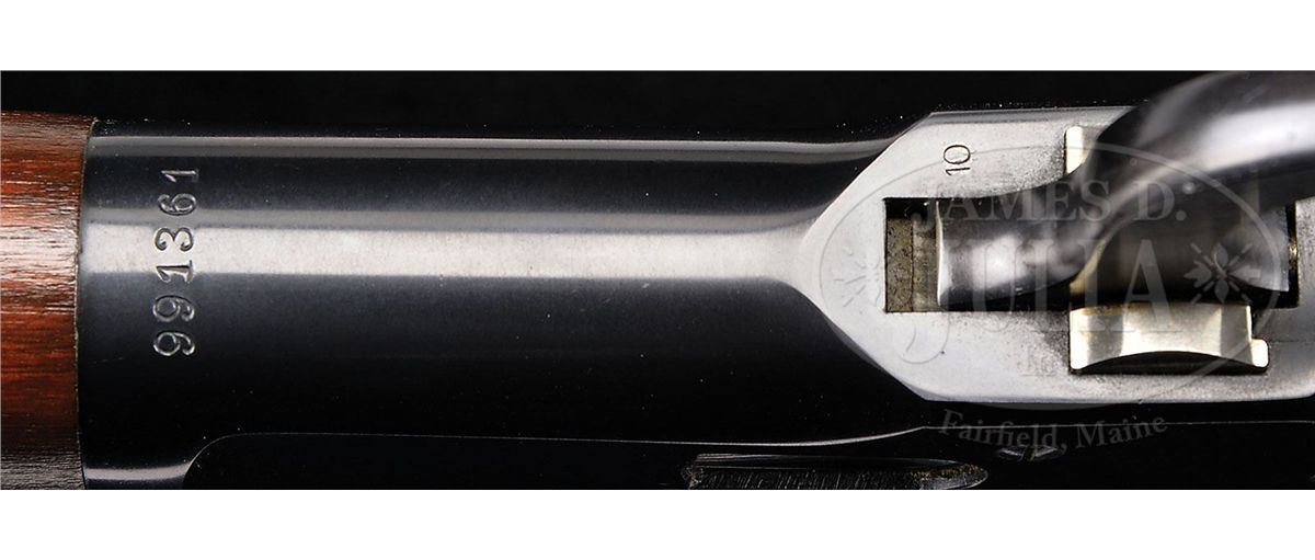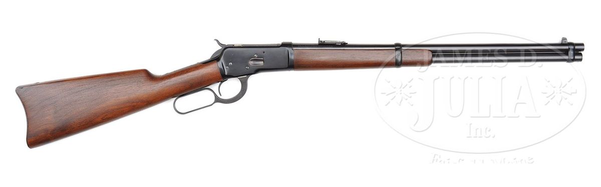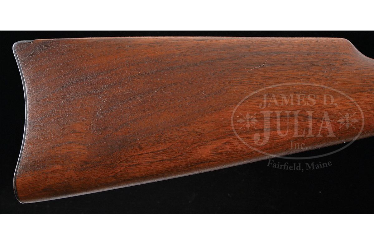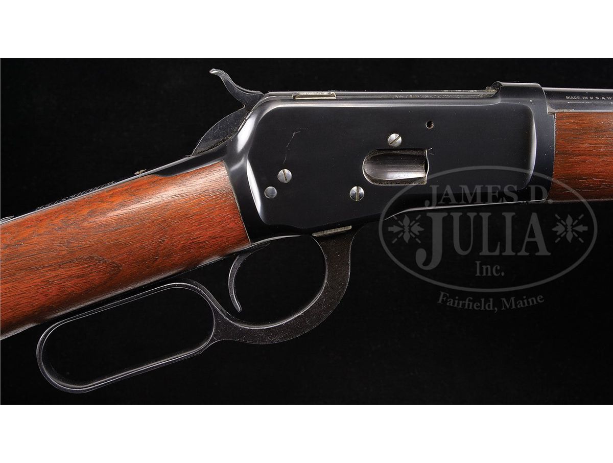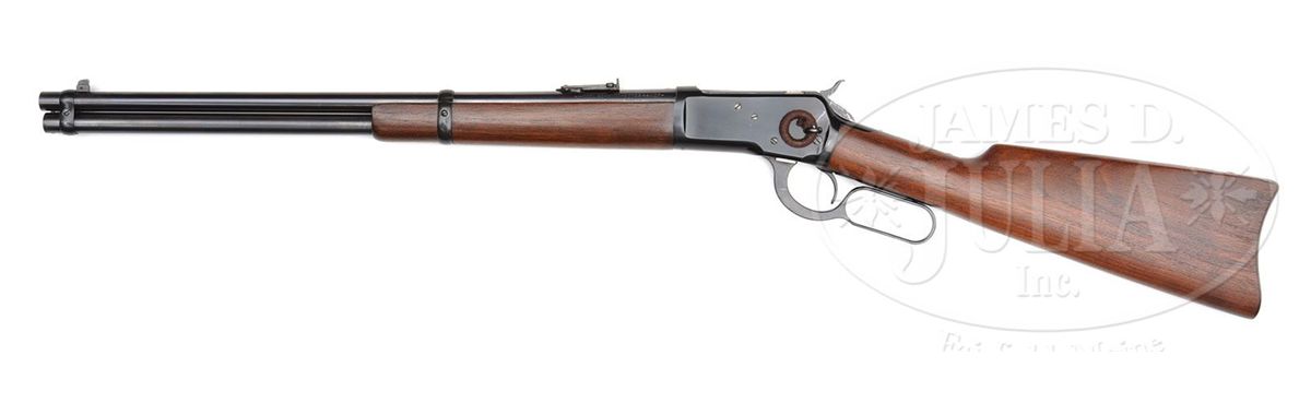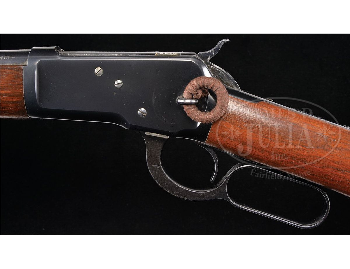 SN 991361. Cal. 44 WCF (44-40). Standard carbine with 20" rnd bbl, full magazine, square base front sight and 2000 yd. carbine ladder rear sight. Left side of the receiver has a staple & ring. Ring is covered with cloth. Mounted with very nicely figured, uncheckered, slab sawed American walnut with straight stock & carbine buttplate. This carbine was produced in 1928 at a time when cowboys were still prevalent in the west and a lot of people still used wagons and buggies for transportation. Most of these carbines were simply tools and are rarely found with high orig finish. PROVENANCE: Woody Frey Collection. CONDITION: Extremely fine plus, all orig. Overall retains about 99% plus crisp, orig factory finish with a couple of tiny scratches on the receiver and a couple of small nicks on the lever. Wood has one tiny nick on the bottom of the stock, otherwise appears to be flawless with all its orig finish. A truly outstanding example that appears to be new and unfired. 4-48456 JR219