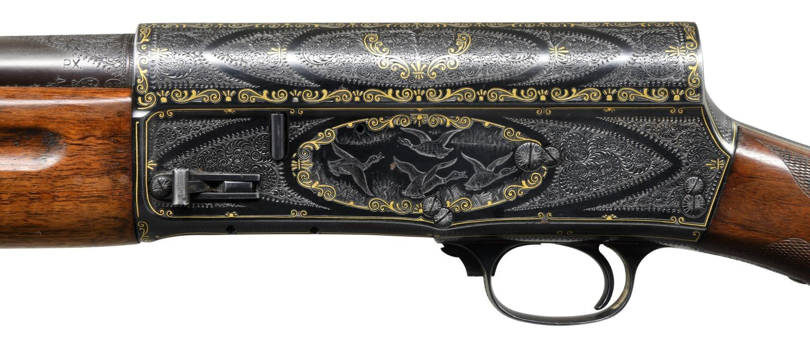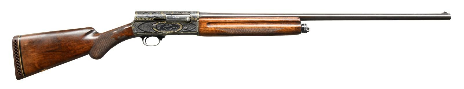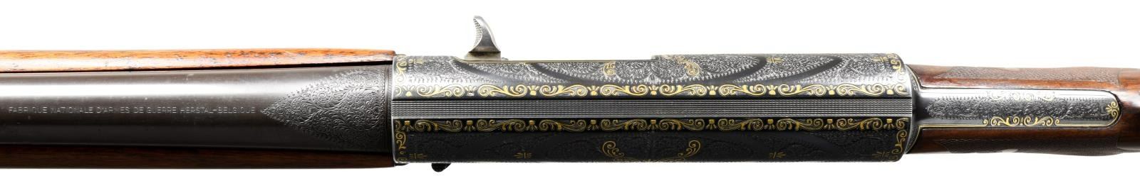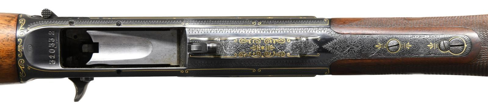 A5 SEMI-AUTOMATIC SHOTGUN. Cal. 12 Ga. 2-3/4". S# 310332 (1950). The 29-1/2" plain barrel choked full, is marked "FABRIQUE NATIONALE D'ARMES DE GUERRE HERSTAL-BELGIQUE" on top rear, in front of 1-1/2" triangle of exceptionally well cut shaded scroll. Blued A5 action is also engraved with near full coverage of this scroll which is outlined by very attractive border of flush gold inlaid individual double ended scrolls, separated by small three rayed sunbursts. This eye catching treatment surrounds ovate game scenes on sides with four mallard ducks flying around a pond on left and four pheasant, one appears to be falling from the sky, on right. Scroll and gold treatment extends to trigger guard bow and tang. This fine work appears to be of factory quality however, a brief search cannot find where this pattern or this grade was offered. Also, no engraver's signature is found so it must be assumed that this is custom work. Round knob buttstock of relatively plain European walnut measures 14-1/2" over brown A&F marked pad. Fancy pattern flat top checkering with fleur-de-lis patterns is at grip and a vacant gold oval is on toeline. Forend wood with finger grooves appears to be of standard grade. MEASUREMENTS: STOCK: DAH: 2-5/8". DAC: 1-5/8". LOP: 14-1/2". WEIGHT: 8 lb. 6 oz. CONDITION: fine as custom finished. Barrel retaining nearly all of an old re-blue. Action retains nearly all of a custom blue most likely applied after engraving was finished. There are a few small scattered patches of rust, mostly on left side above trigger. Stocks retain most of an old oil finish, possibly original, with added oil. Bore is bright and shiny. Mechanically good. (23-2051/MGM). C&R. $3,500-5,500.