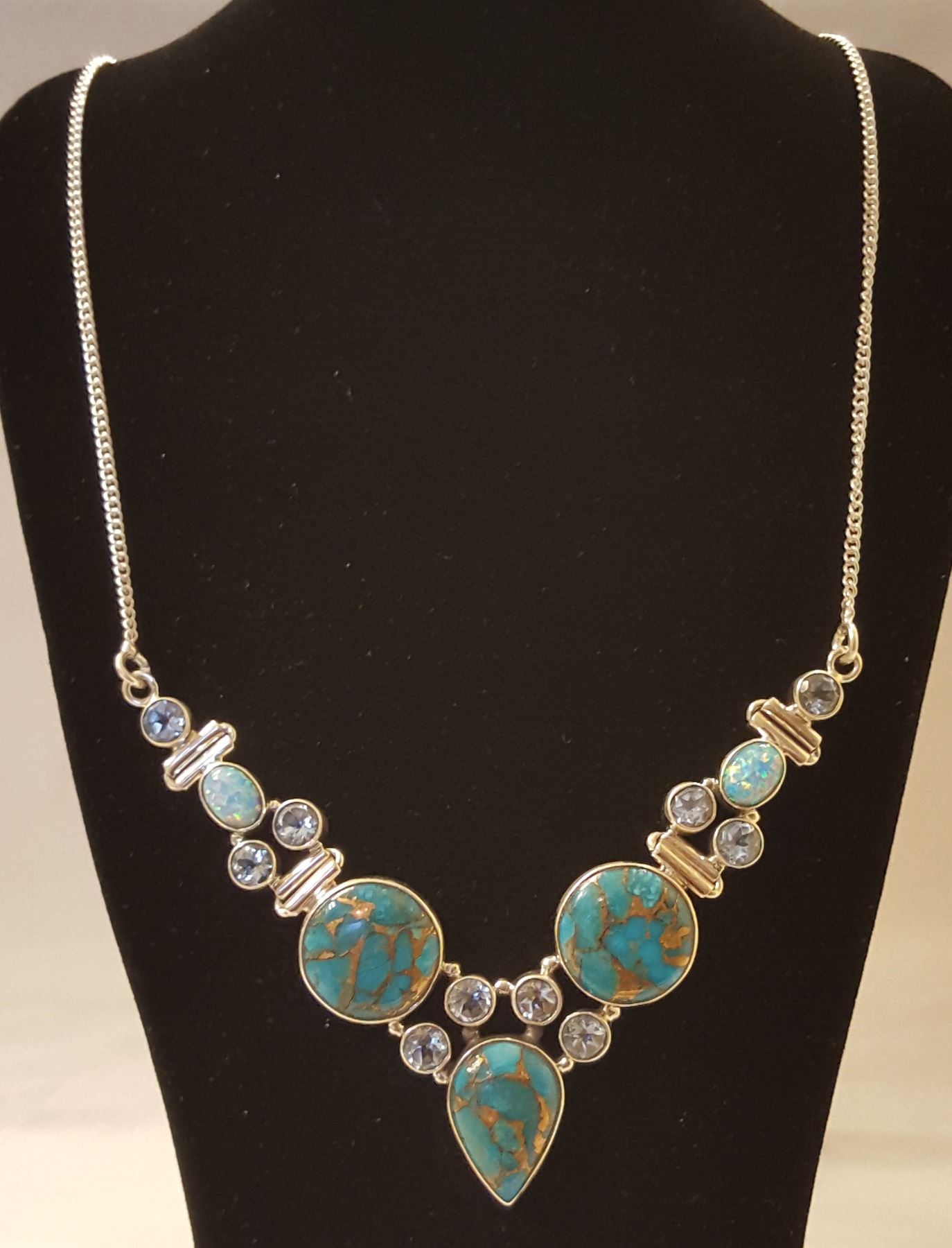 BEAUTUFUL 25 CT NATURAL ARIZONA BLUE TURQUOISE AND COPPER ACCENT NECKLACE. INCLUDES 10 SKY BLUE TOPAZ HIGHLIGHT STONES ALONG WITH 2 BRILLIANT FIRE OPALS. MOUNTED IN SOLID .925 STERLING SILVER. 19" LONG .925 STERLING SILVER CHAIN.110 CTTW OR 22 GRAM TOTAL WEIGHT. GET READY FOR THE COMPLIMENTS ON THIS ONE