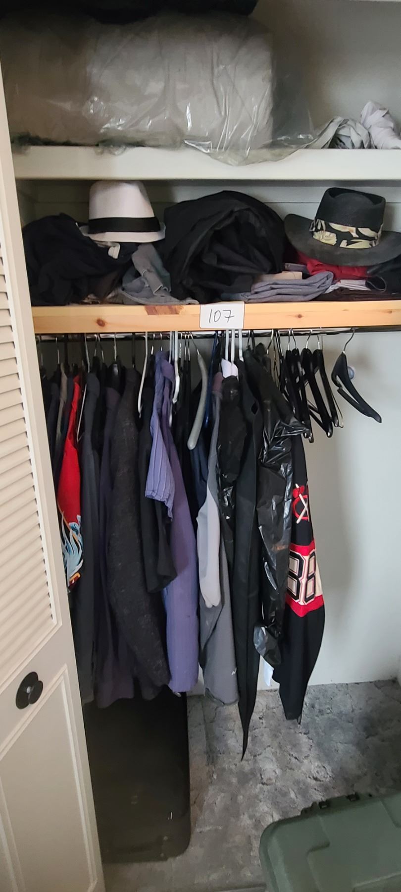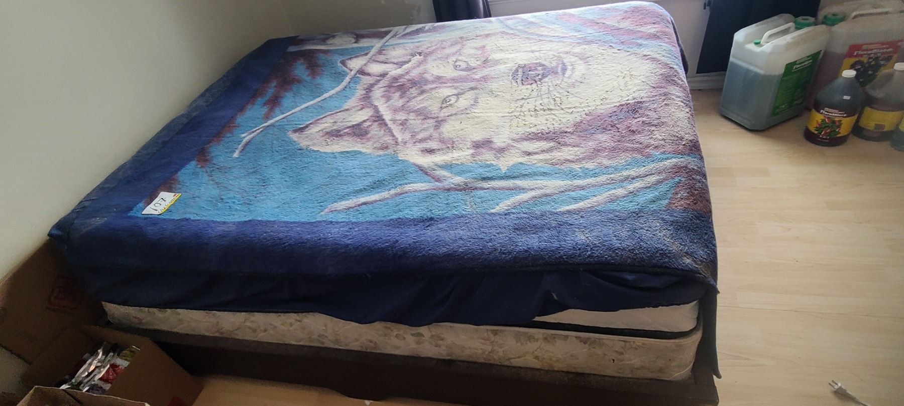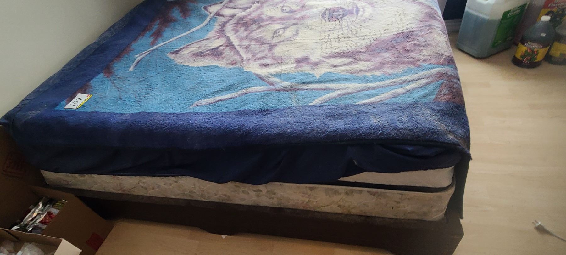 BED FRAME/BOX SPRING PLUS ALL ITEMS IN LEFT SIDE CLOSET INCL BLACK HAWKS JERSEY