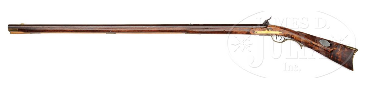 NSN. 43" full oct .45 Cal rifled bbl marked "JM". Bbl tang is engraved. Percussion lock is badly pitted but initials "JM" can be made out on lock as well. 4-pc brass patchbox is engraved and has a "Q" finial with one piercing. Oval silver inlay on cheek engraved with American eagle. Brass sideplate has 1-lock screw and a small wood screw in the forend. Gun has double set triggers. PROVENANCE: Frank Sujansky Collection. CONDITION: 5" crack on right hand side of forend beginning at muzzle cap. Percussion lock is not working and has a replaced hammer. Screws in patchbox are replacements and patchbox spring was incorrectly repaired with a stud through the patchbox door. Stock has been cleaned, removing most of the orig finish. 4-49439 RG55