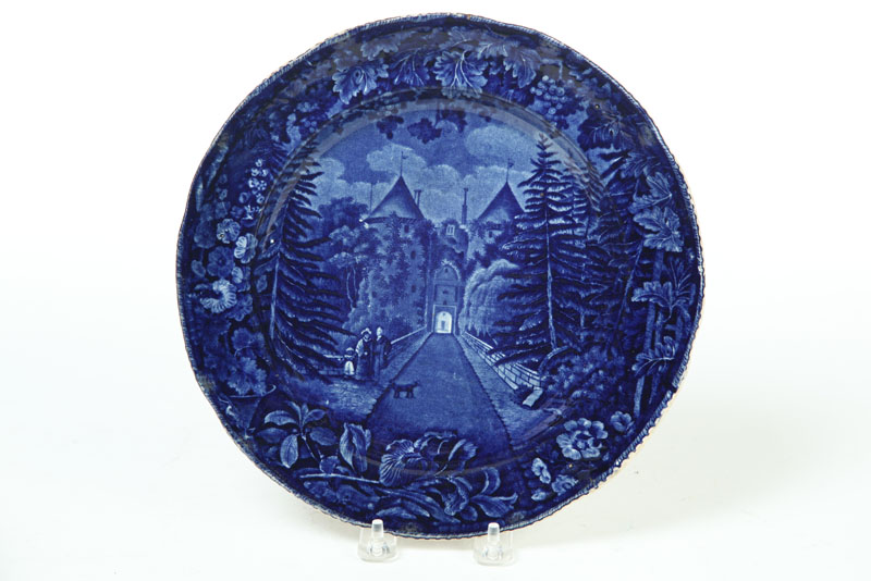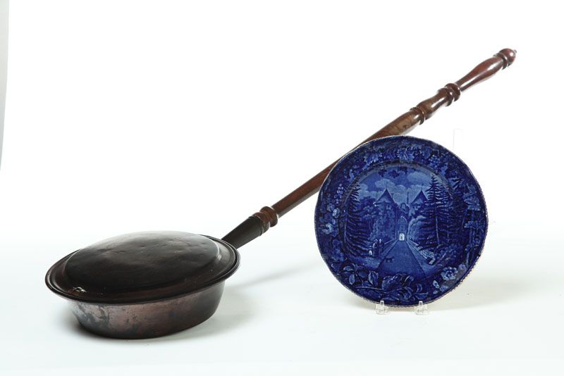 Nineteenth century. American copper bedwarmer with turned handle, 43"l., and an English Historical Blue Staffordshire plate "La Grange", 10"d.