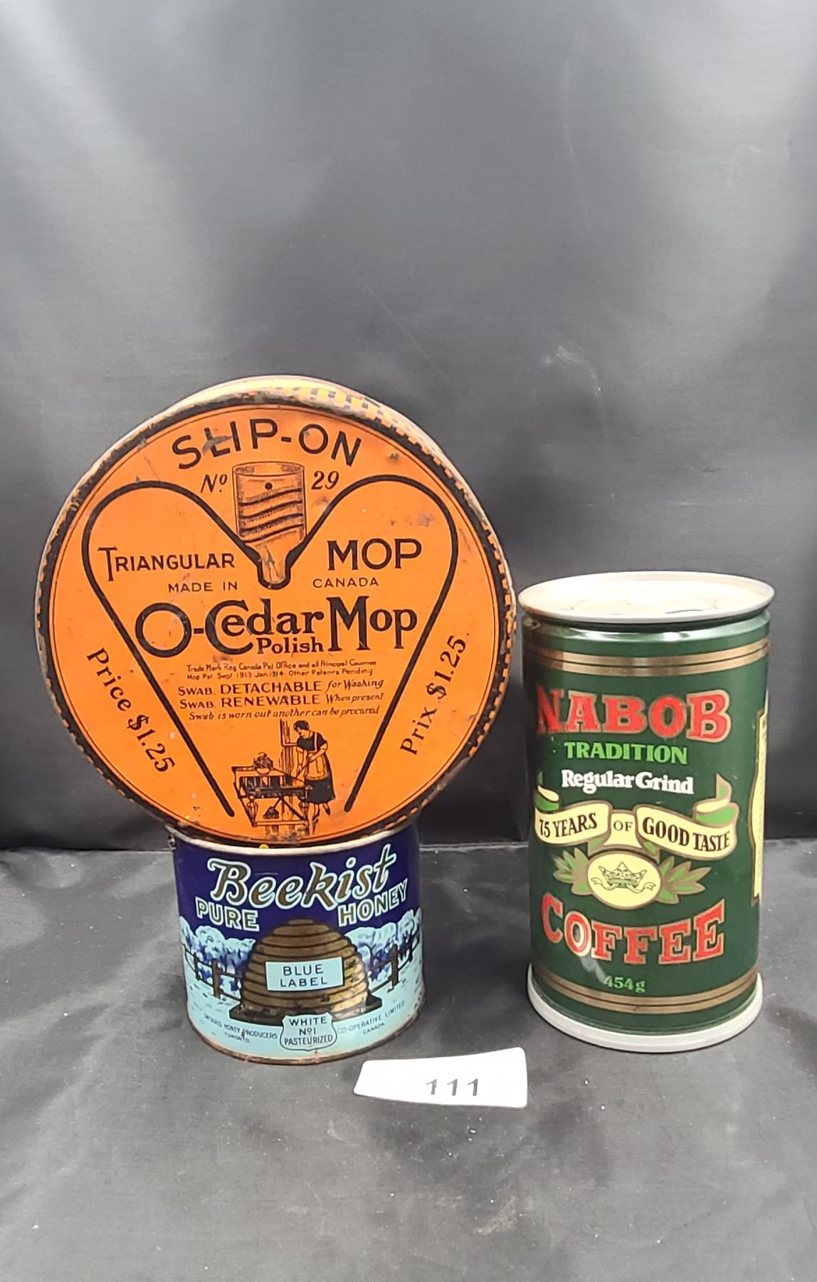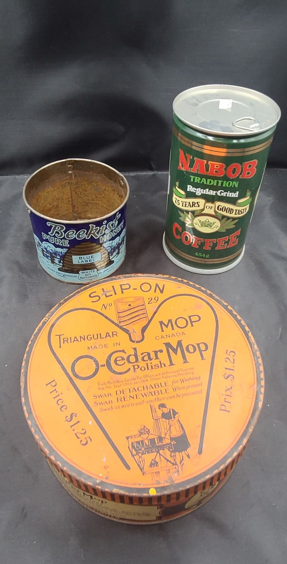 BEE KIST HONEY, SLIPON CEDAR MOP CAN, NABOB COFFEE CAN