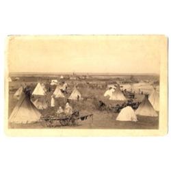 Boudoir. No imprint. Pen inscription on verso: "Beautiful Ind. Village on north Canadian at the ford north of Fort Reno/ beef issue day. Caddo Springs tribes in horizon." Lots of rich details ibn every area of life on the reservation. Skins drying on wagons. [3]