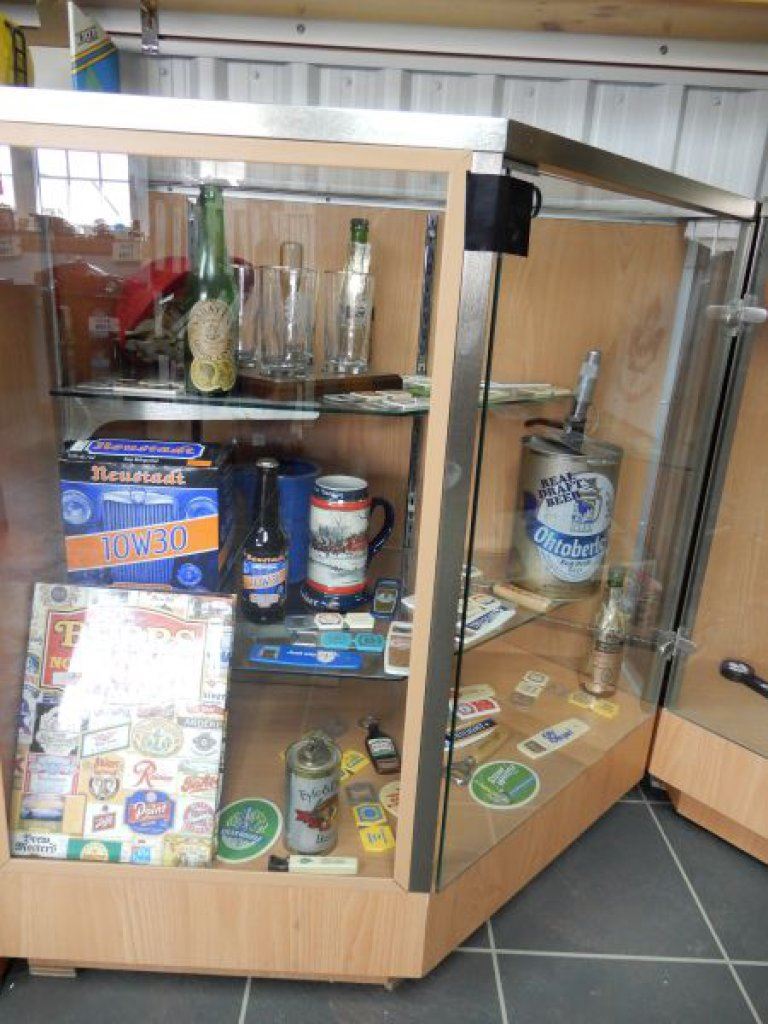 BEER RELATED MEMORABILIA BEERS OF NORTH AMERICA BOOK- BOTTLE OPENERS - OLD RED CAP & LABATT BOTTLES - SMALL KEG- STEINS - SET OF 4 BLUE JAY GLASSES WITH WOODEN STAND LOCATION: TOY ROOM