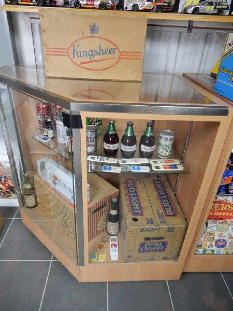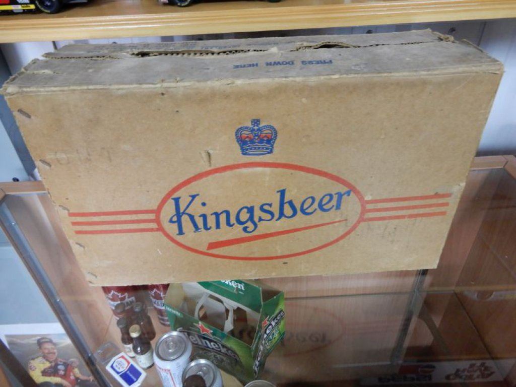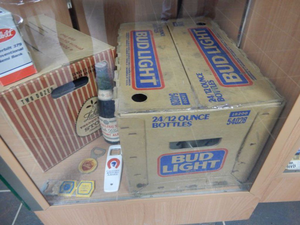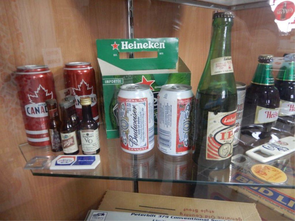 BEER RELATED MEMORABILIA OPENERS- LABATT IPA - CARLING WHITE LABEL- HIEDELBERG BOTTLES - 3 CARDBOARD CASES - LABATTS STOUT- MOLSON CANADIAN TRUCK BANK/BOX LOCATION: TOY ROOM