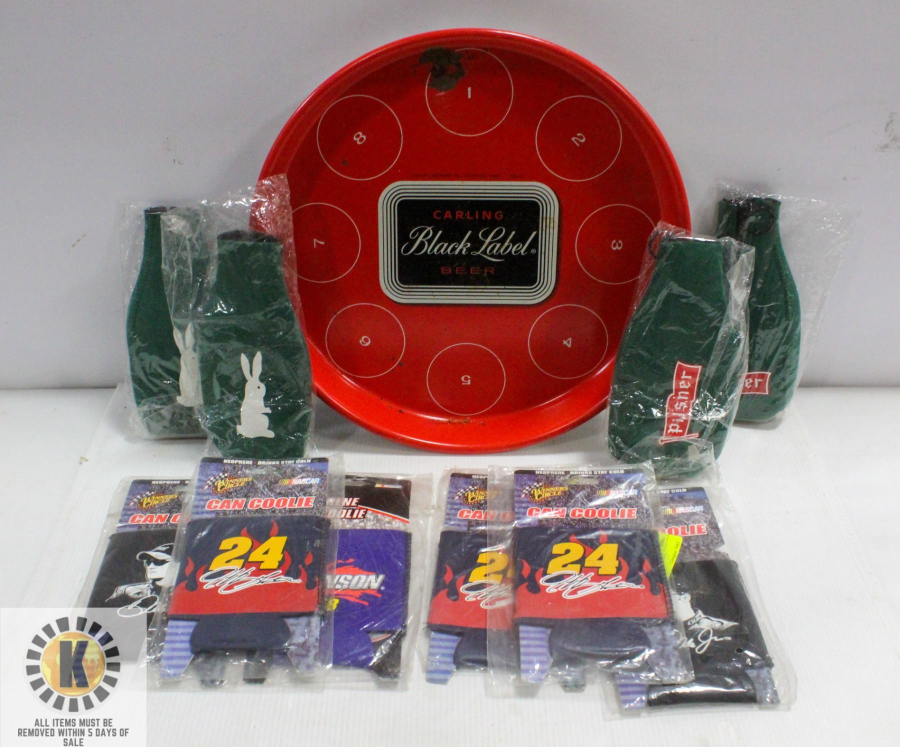 VINTAGE CARLING BLACK LABEL STEEL BEER TRAY, WITH 6 NASCAR & 4 PILSNER BEER COZIES**ALL ITEMS MUST BE REMOVED BY 5PM FRIDAY, AUGUST 5TH, 2022. ALL REMAINING ITEMS WILL BE SUBJECT TO A $6.00 PER DAY STORAGE CHARGE. ANY ITEMS REMAINING AFTER FRIDAY, AUGUST 19, 2022 WILL BE CONSIDERED FORFEITED. NO REFUNDS WILL BE ISSUED FOR FORFEITED ITEMS.** TO SCHEDULE A PICK UP APPOINTMENT CLICK HERE