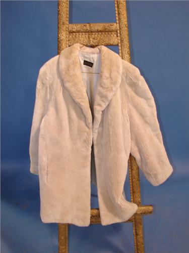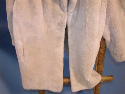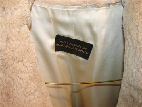BEIGE DYED SHEARED BEAVER STROLLER. Label reads “Made in Canada”. “Desiree” embroidered on lining. Hidden hook closure. Size 12. Has appraisal.