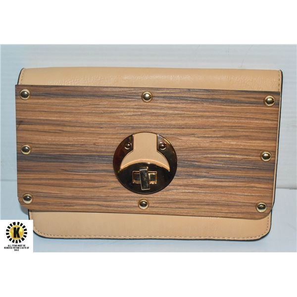 BEIGE LEATHERETTE AND FAUX WOOD CROSSBODY PURSE