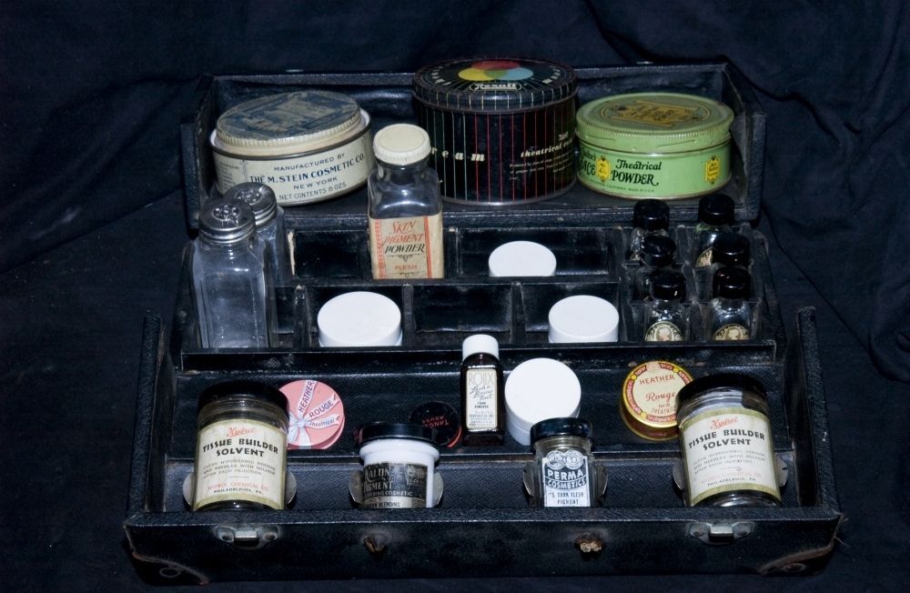 IT IS A MORTICIANS MAKE UP KIT WITH BOTTLES AND TINS OF BROW DARKENER,LIP ROUGE,ETC.A FEW INTERESTING ITEMS ARE ONE THAT CONTAINS "SUN TAN" MAKE UP. I ASSUME PART OF THE ORIGINAL KIT,AND A PIECE HE KEPT IN IT FOR IRONY. THE MOST INTERESTING ITEMS ARE 2 BOTTLES OF A SUBSTANCE CALLED "TISSUE BUILDER SOLVENT". THIS IS SYRINGE CLEANER! NOW WHAT WHAT THEY BE DOING IN A MAKE UP KIT?