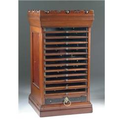 BELDING BROS. & CO. SPOOL CABINET. This thirteen-drawer spool cabinet has been refinished with all advertising removed. Top features a scroll-cut gallery and includes twelve glass-front drawers. Circa 1910. SIZE: 19” w. x 37” h. x 19” d. CONDITION: Completely refinished. PF 1-3348 (400-600)