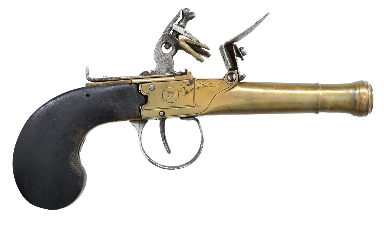 Cal. 45. NSN. Bbl. 3" w/ cannon muzzle. Left side of bbl. has circled "E/LG" Belgian proof. Both sides of frame have four-leaf clover. Bottom of trigger guard marked w/ leaf. No other visible markings. Center mounted hammer & safety. Frizzen is a bit loose. Gutta percha grip assembly that has a loose fit. CONDITION: grip assembly has a couple cracks around tang, scattered handling wear & scratches. Brass frame & bbl. are a dull yellow patina w/ scattered dings & oxidation. Bright parts are a dull gray patina w/ scattered oxidation & pitting. Oxidized bore. (01-23632/MJC). ANTIQUE. $300-400.
