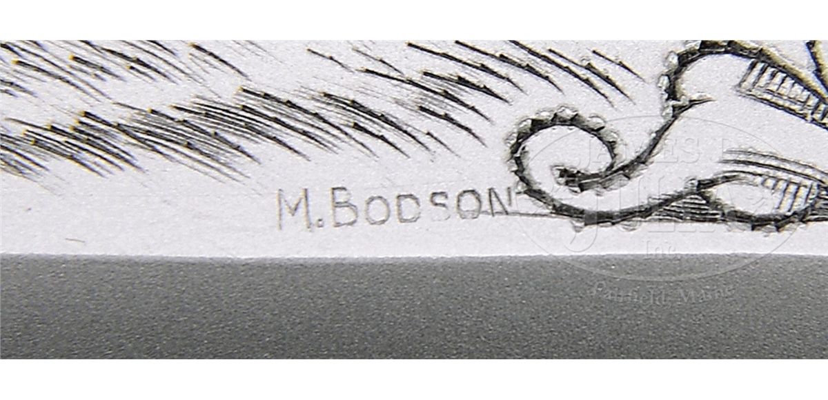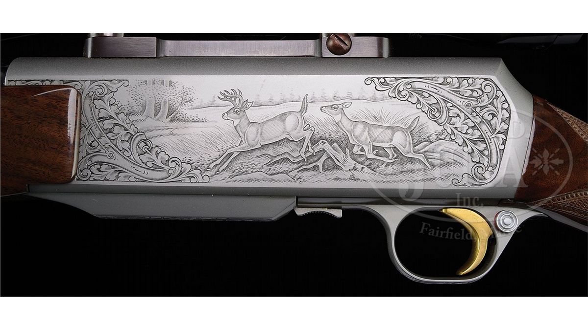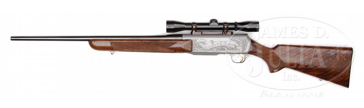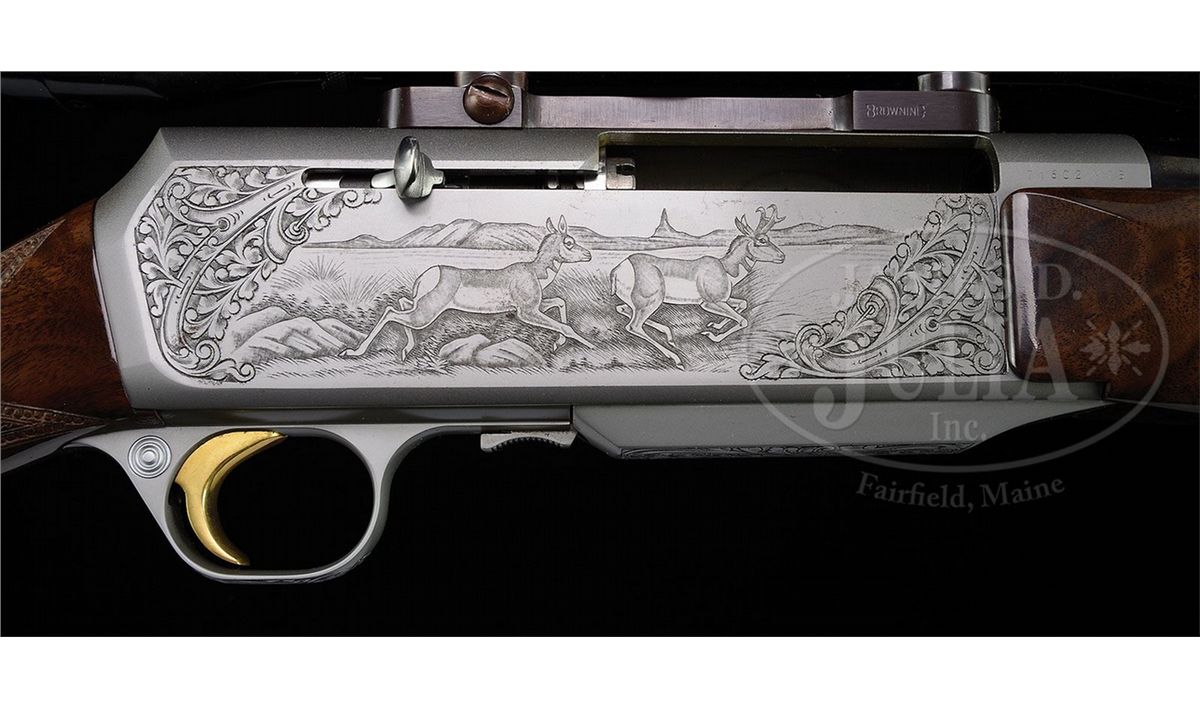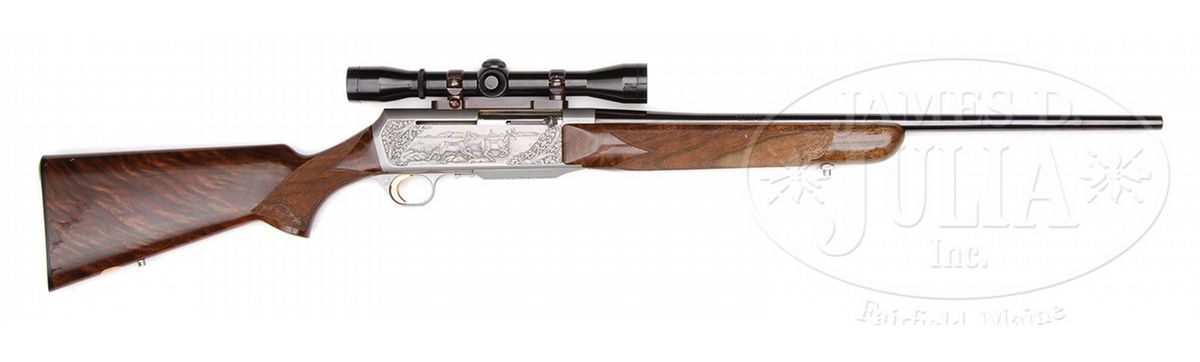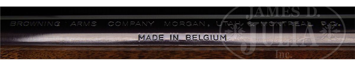 SN 71602M75. Cal. .270 Winchester. Standard configuration. No sights on bbl, which is marked "Made In Belgium". French gray receiver is engraved with large foliate scroll flanking scenes of antelope and white tailed deer. Deer scene is signed by engraver, M. Bodson. Finely quilted figure walnut stocks feature point pattern engraving with bead carved borders having scrolled flourishes at ends. Buttstock is fitted with Browning buttplate, sling eyes, and a gold oval engraved "P". LOP: 13-3/4". A Browning 5X scope with crosshair reticle is in Browning mount on top of receiver. CONDITION: Excellent, all original, showing very little use with a few minor marks in wood mostly at right butt, and a few at toe. There is a slight mark on left side of action, right side slightly browned. Bore is excellent, bright and shiny throughout. Scope looks new, optics are clear. 4-47119 MGM9