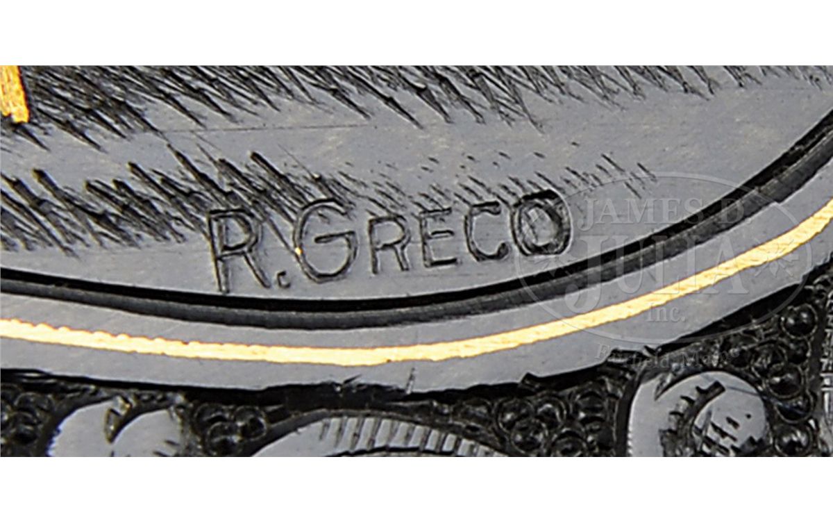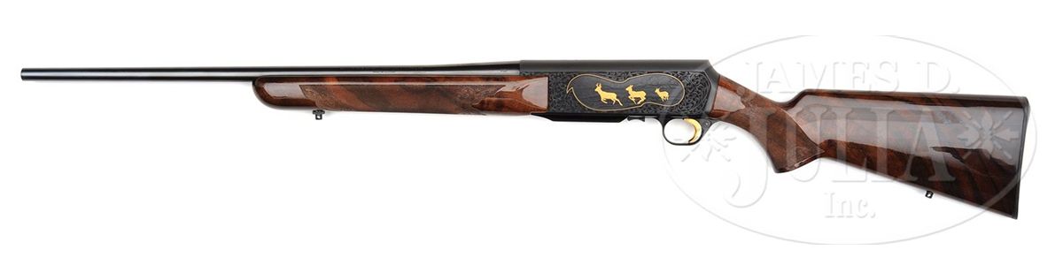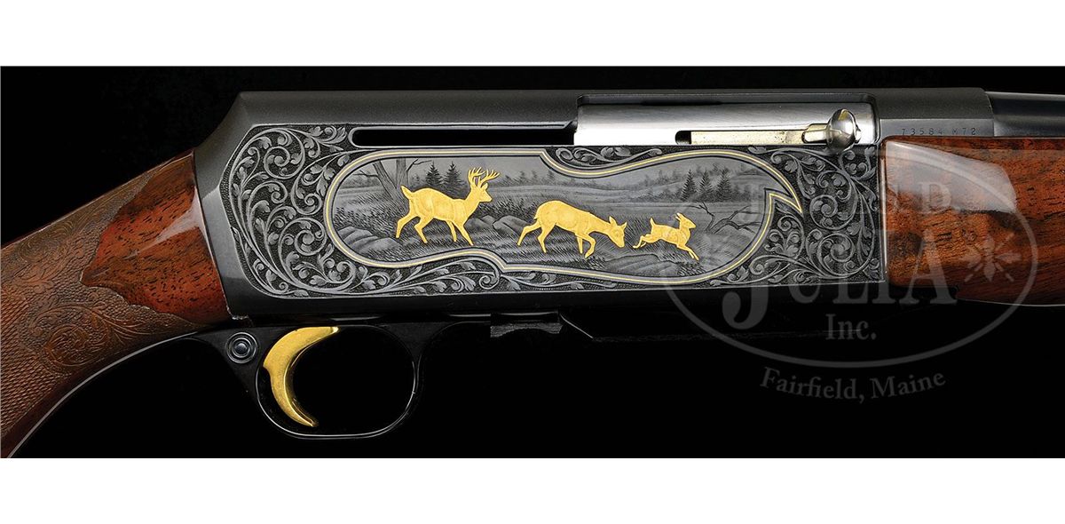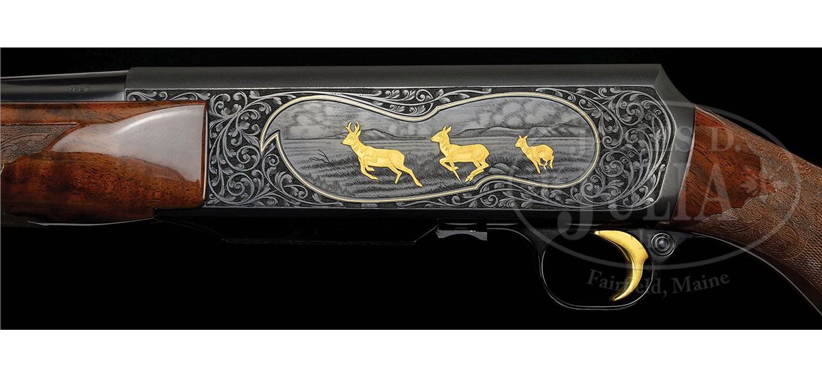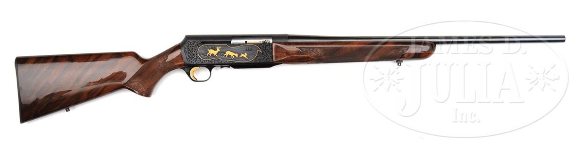 SN 73584M72. Cal. 30-06. 22" Bbl. No sights. Blued action is engraved with large, semi-relief, open scroll with acanthus highlights and stippled background, framing vignettes of gold inlaid medium weight game within gold wire surrounds. A trio of antelope are in prairie with hills in background on left side of action, and a family group of mule deer (buck, doe, and fawn) walk into meadow, on right. Left scene is signed "R. Greco" at bottom rear. Scroll is signed "Bleus" under left scene. Nicely marbled claro walnut stocks have checkering with fancy borders terminated by carved acanthus scroll. Butt is fitted with Browning composition plate. Weight: 7 lbs. 8 oz. LOP: 13-3/4". CONDITION: Excellent, essentially as new, appears unfired. 4-49045 MGM195