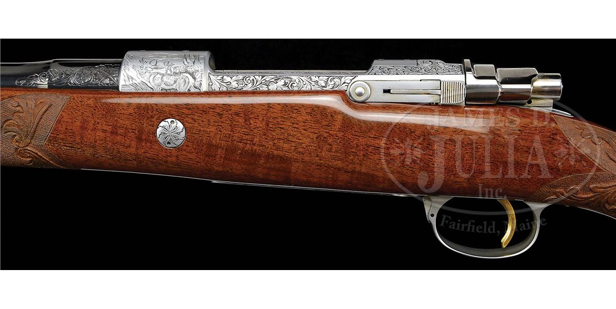 PLEASE NOTE (10-10-13): Wood has been tested for salt with silver nitrate. Result is negative. SN 8P48392. Cal. 30-06. 22" Bbl, no sights. Standard configuration. Coin finished large ring FN Mauser action is semi-relief engraved with large, flowing scroll and acanthus. Receiver ring is engraved with bellowing elk on left, and prancing pronghorn on right, both are both signed "F Marechal" at bottom. Scroll extends 2" down side of bbl. Bottom metal is more finely engraved with matching scroll, with portrait of mule deer on floorplate, and large bear on trigger guard bow. Engravers initials "LA" are at bottom of deer scene. Flame figured American walnut stock features large Monte Carlo right hand cheekpiece, rosewood grip cap and forend tip with white line spacers, as well as fancy border checkering with acanthus carving. Weight: 7 lbs. 6 oz. LOP: 13-3/4". CONDITION: Excellent, retaining nearly all orig factory finishes with some light handling marks. Checkering and carving are beginning to darken. Mechanically crisp. 4-49043 MGM197